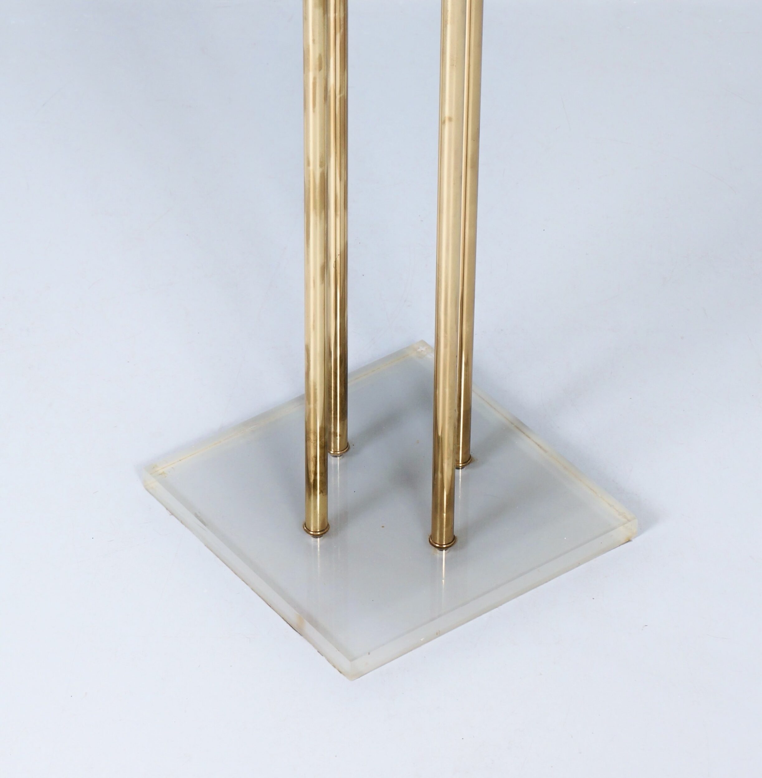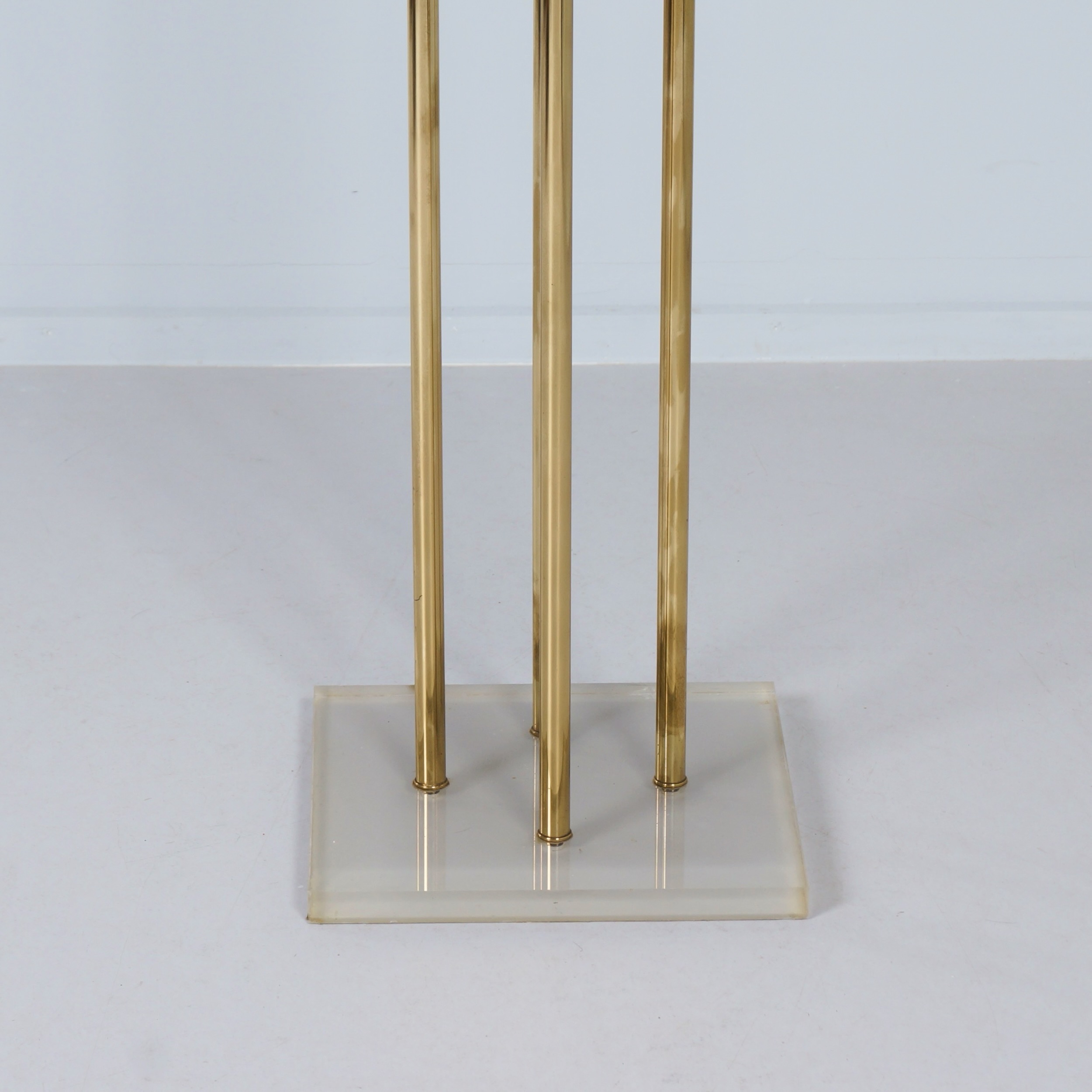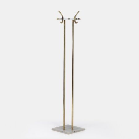 The coat stand is constructed from four slender brass tubes combined with clear acrylic (perspex) and features refined, visible solid brass connections. The design is in the style of Willy Rizzo, characteristic of the Hollywood Regency aesthetic of the 1980s. The transparent material gives the piece a light, almost floating appearance, while remaining sturdy and functional. A thin layer of felt is applied underneath the base (likely original) to protect the acrylic. Dimensions: 41 x 41 x 177 (H) cm. Base: 35 x 35 cm.