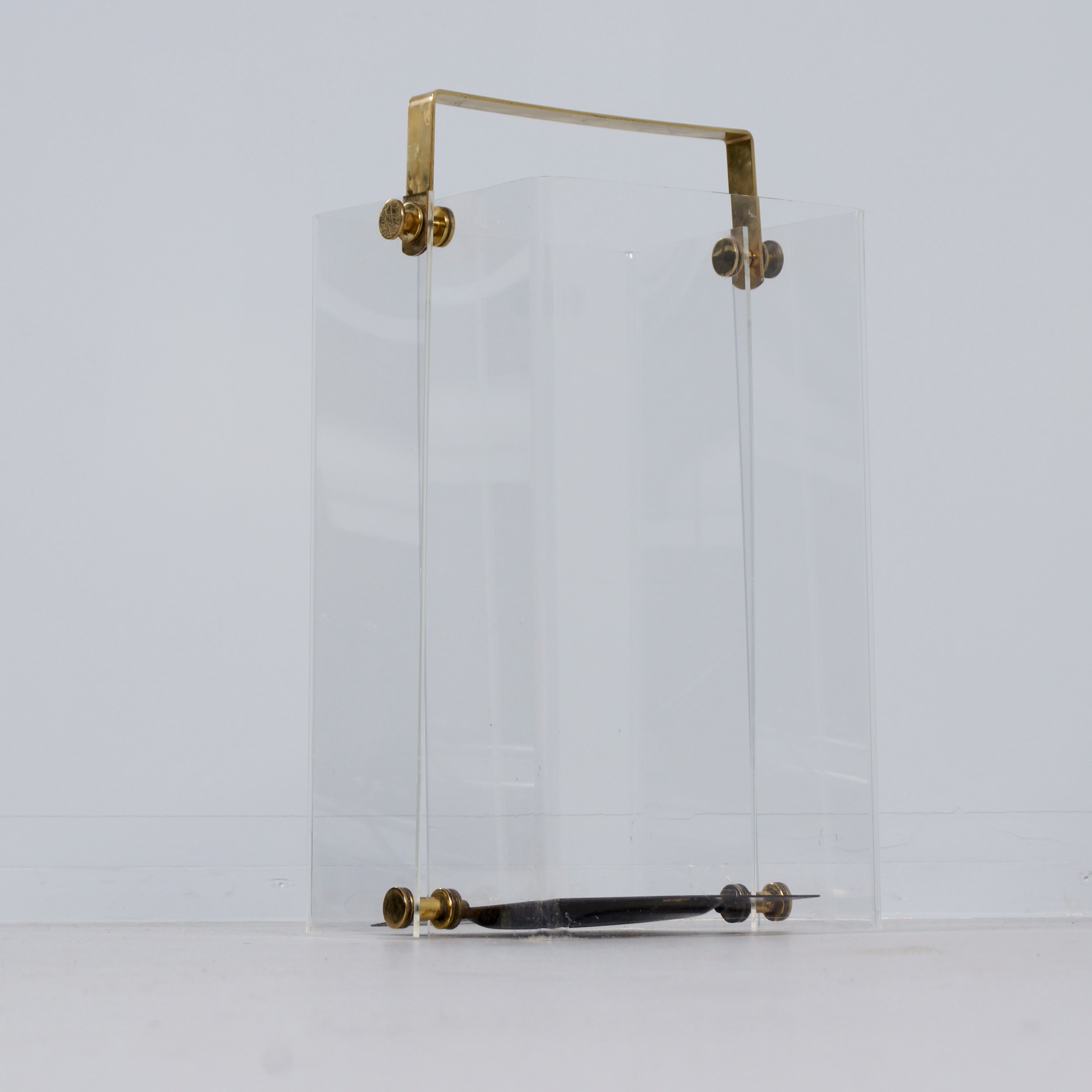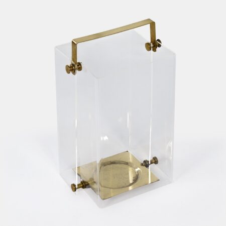 The design consists of two shaped transparent panels with visible solid brass connections. At the bottom, a drip tray is integrated to collect water. Designed in the Hollywood Regency style, it combines an open, lightweight appearance with practical functionality. Dimensions: 23 x 30 x 52 (H) cm.