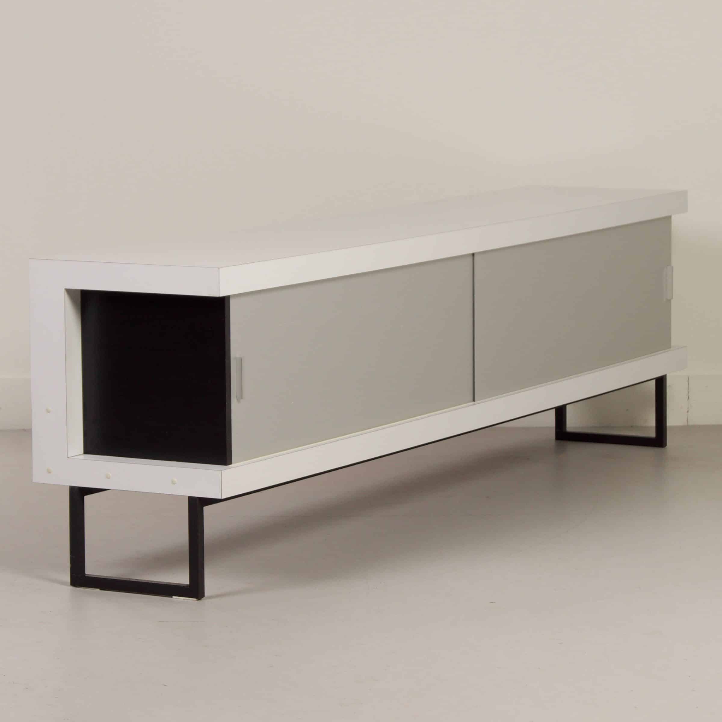 White Sideboard model D242 designed by Wim Wilson in 1964 for Castelijn. The sideboard stands on a black metal base, but can also be hung floating on the wall if desired (without base). Layout: two sliding doors with three drawers behind them and two height-adjustable shelves (in short, lots of storage space). The white caps on the side are from a desk that came with it (from the same series). Unfortunately, this desk is no longer available. The condition is still good, normal traces of wear and use; the top is still very nice, the doors have some scratches (see photos). Material: anodized aluminium, white laminate, wood and metal. Color: black, white and silver. Dimensions with base: h x w x d = 71 x 242 x 48 cm.