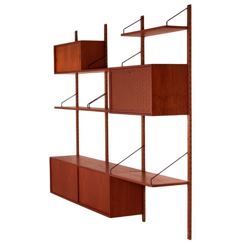 Cadovius wall system Royal for Cado. This Danish Royal wall system is designed by Poul Cadovius for Cado, Denmark in the ’60s. Poul Cadovius was designer and furniture maker and is best known for the design of this Royal System. These systems have been manufactured since 1944 and are one of the design classics of the last century. Considering its age this vintage teak wall system is still in original and in very good condition. This system is made of; four wall slats of 200 cm, small cabinet with glass shelf (HxWxD 33/80/30 cm), cabinet (with lock) two drawers and shelf (51.5 / 80/40 cm), sideboard cabinet (42.5 / 160 / 37.5 cm) with 2 wooden sliding doors right two small drawers and a shelf, five book shelves one shelf is 24 x 80 cm, one is 38 x 80 and three shelves of 30 x 80 cm. The price is (only) for the Royal system. With key and marked, Royal system, design Poul Cadovius.