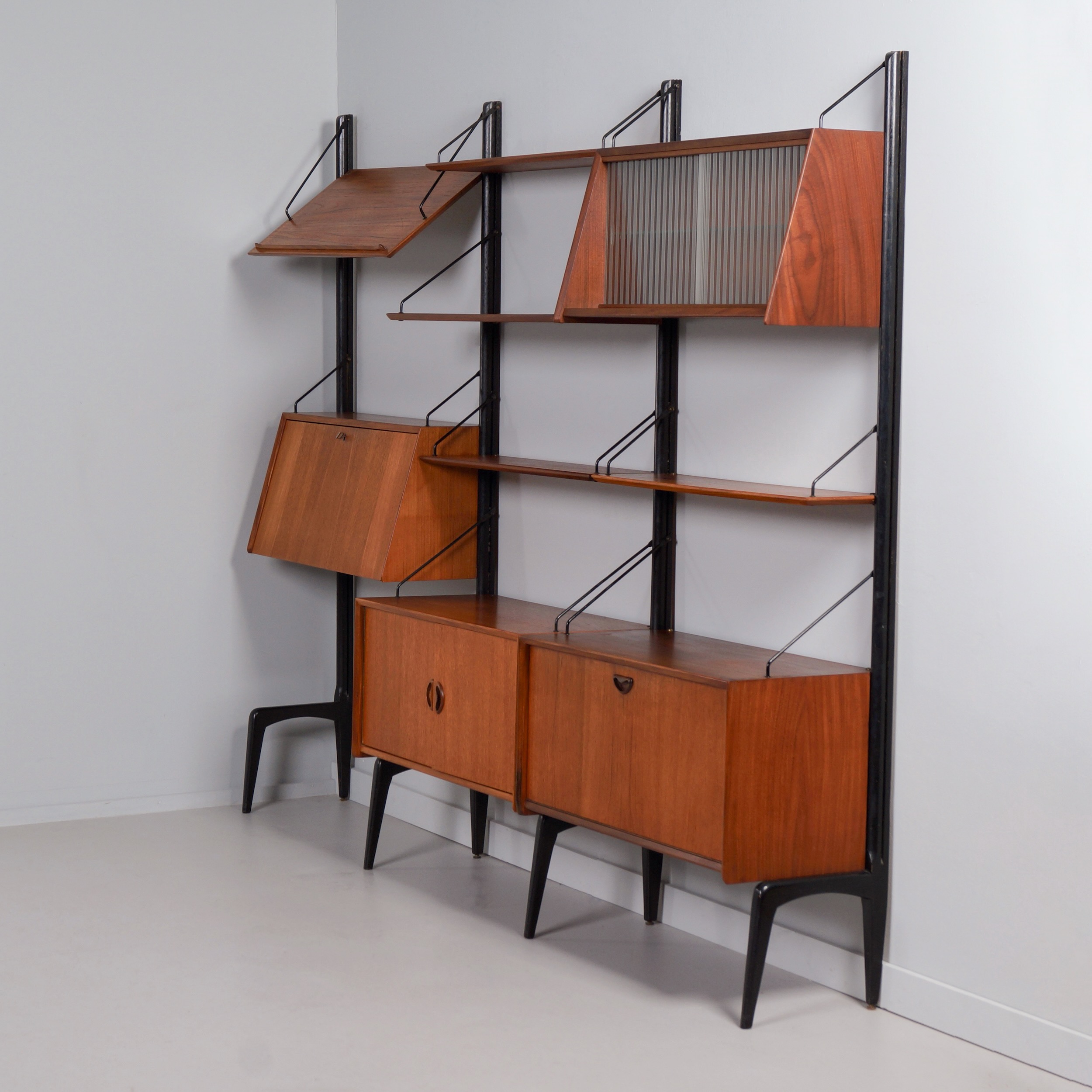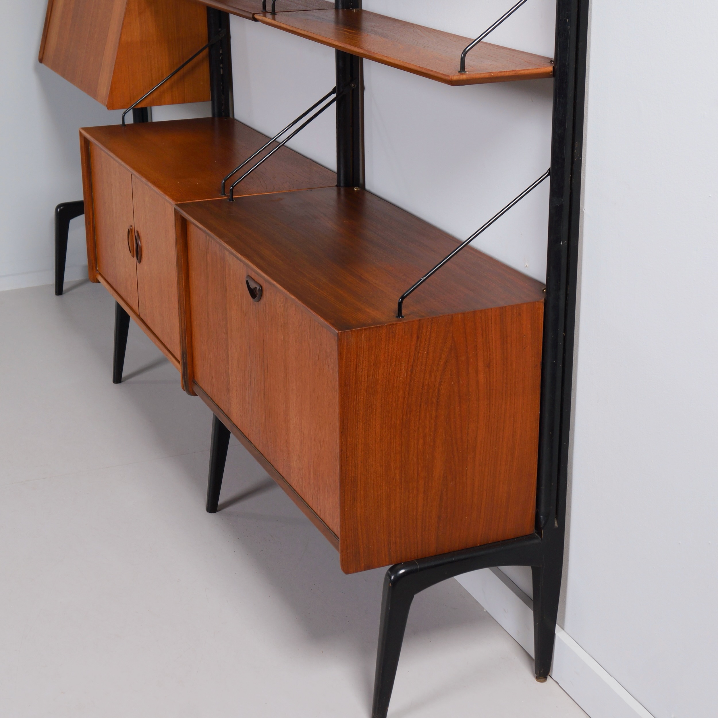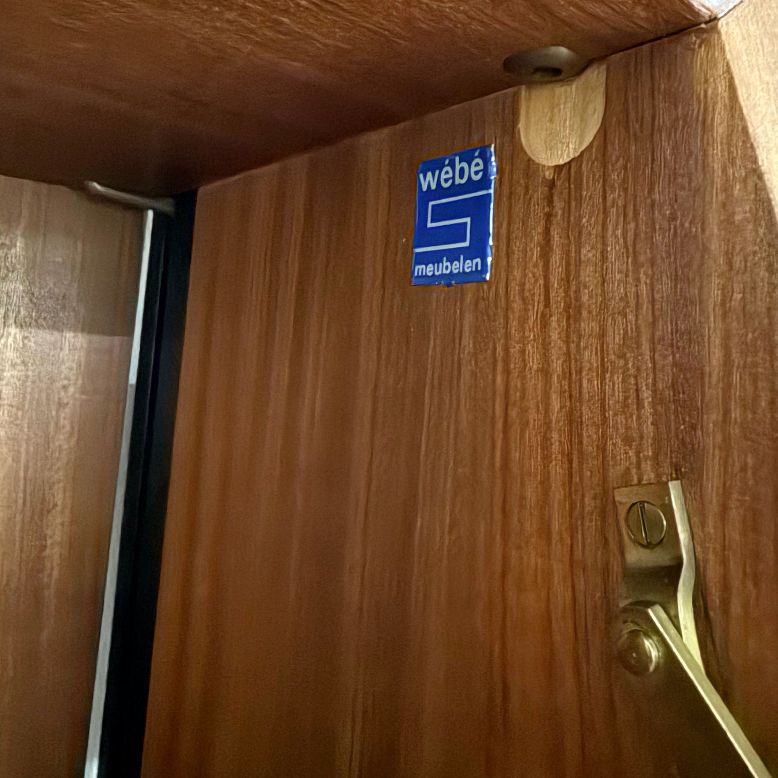 The wall system was designed by Louis van Teeffelen and produced by Wébé around 1960. The unit is demountable and can be configured as desired. It is made of teak and teak veneer with black metal uprights and brass details. The overall dimensions as shown in the photo are 200 × 260 × 40 cm (H×W×D). The system consists of four black uprights of 200 cm high, a secretaire or bar unit of 40 × 85 × 32 cm (H×W×D), a cabinet with doors of 40 × 85 × 40 cm (H×W×D), a drop-down cabinet of 40 × 85 × 40 cm (H×W×D), a display cabinet of 40 × 85 × 33 cm (H×W×D), one shelf of 32 × 85 cm (D×W), three shelves of 22 × 85 cm (D×W) and a magazine shelf of 40 × 85 cm (D×W). The piece is marked Wébé and comes with key. Source: Wébé catalogue Meubelen die blijven, 1960.