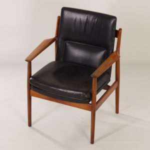 INCL. VAT ACCORDING TO THE MARGIN SCHEME (IF APPLICABLE)Arne Vodder chair model 431 of solid rosewood and black leather designed for Sibast Furniture in the 1960s. Beautiful for its design and superb wood joints. The condition of this vintage chair is still good and original with normal signs of use; no holes and or tears in the leather, some colour difference on the armrests. Dimensions: h x w x d = 88 x 68 x 62 cm. The seat height is 46 cm and the armrest height is 61 cm. Branded: Sibast furniture made in Denmark. Source: catalogue: Arne Vodder, Sibast.
