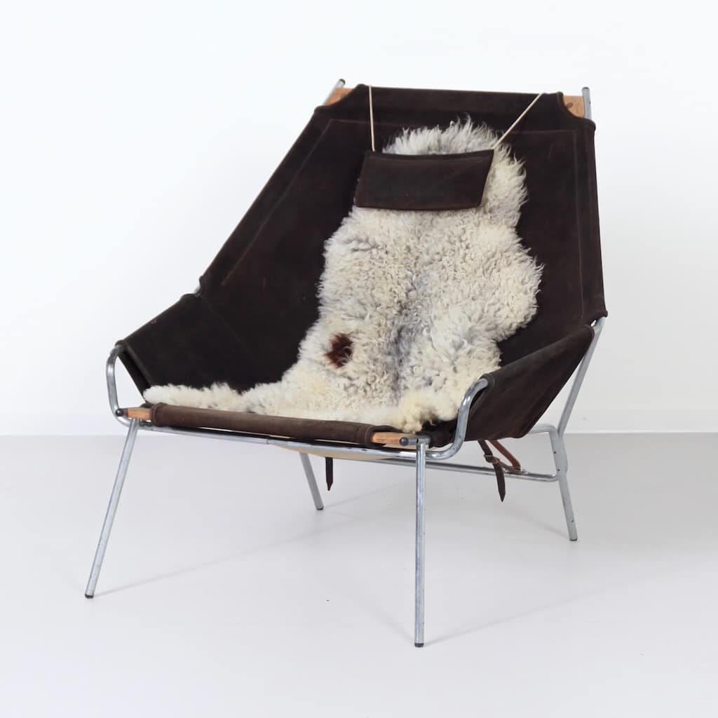 INCL. VAT ACCORDING TO THE MARGIN SCHEME (IF APPLICABLE)Rare Bovirke Armchair Model J361 designed by Erik Ole Jørgensen (1925-2002) and made at Danish Bovirke in 1954. The condition is still good with the original head cushion. It has been completely checked by us and repaired where necessary. The suede has two professional strengthening repairs (one old and one new repair, see photos) at the bottom (near the corners), making it sturdy again. Material: metal, frame, oak fixing slats, suede leather and sheepskin. Dimensions: h x w x d = 85 x 83 x 84 cm and the seat height is 36 cm. It is sold with the sheepskin in the picture.