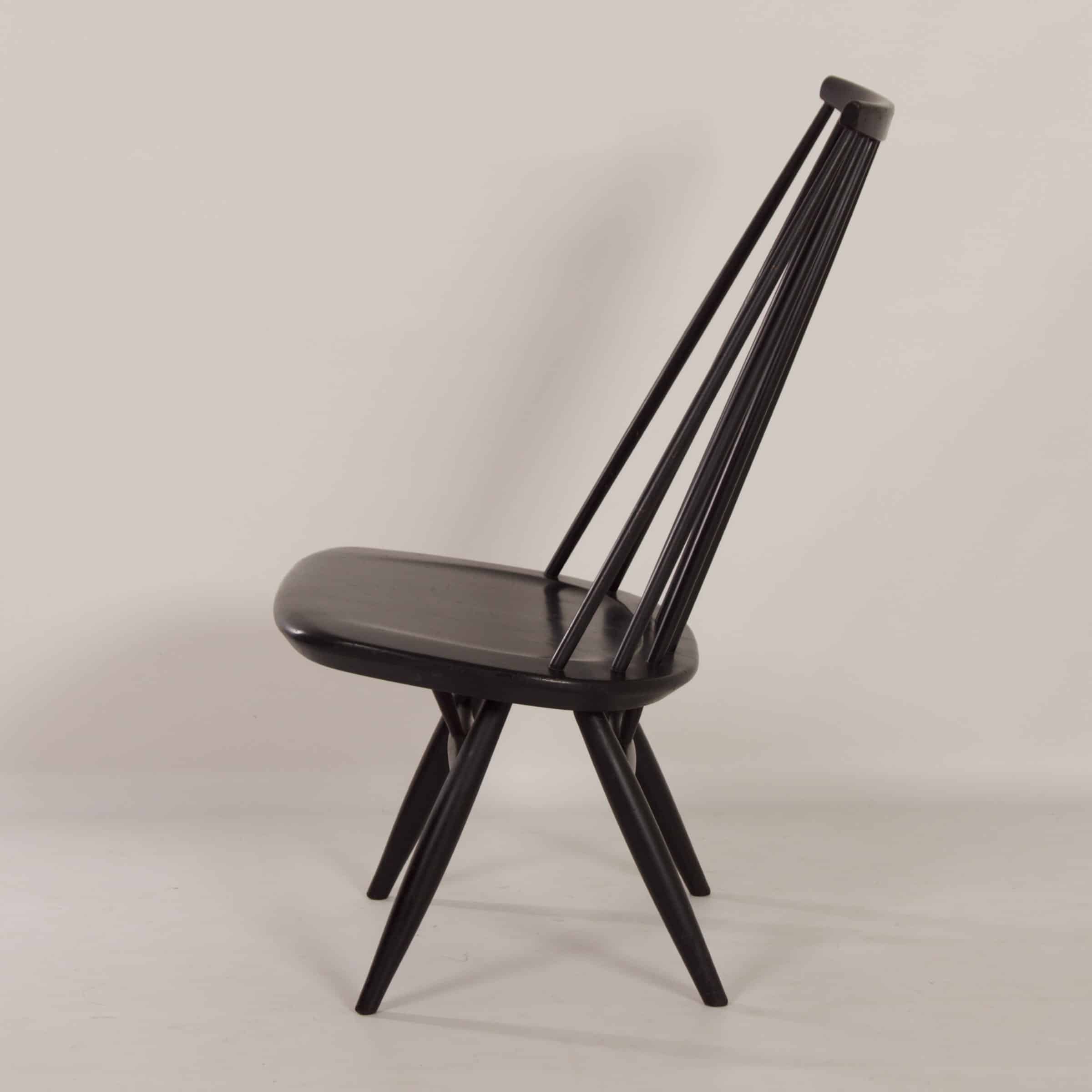 Scandinavian chair “Mademoiselle” designed by Ilmari Tapiovaara for Asko in the 1960s. Ilmari Tapiovaara designed various chairs, including the well-known “Mademoiselle” chair. He designed this chair in 1956, after which it was produced at Asko. Because the Mademoiselle was so popular, other manufacturers also started making these chairs. This is an original Mid-Century copy of Asko from the sixties. The condition is still good, normal traces of use and wear, scratches, small dents, some paint damage. Material: wood (black). Dimensions: h x w x d = 90 x 55 x 64 cm and the seat height is 40 cm. Material: Birch wood. Marked: Asko (see photos).