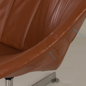 INCL. VAT ACCORDING TO THE MARGIN SCHEME (IF APPLICABLE)Swivel chair “Modello” designed by Rudolf Wolf for Rohé Noordwolde in the 1960s. A very progressive model for the time with a comfortable seat. The Rohé catalogue says about this: “The materials and the resulting form were combined in such a way that an extreme perfection was achieved both technically and aesthetically. This easy chair was once reupholstered with brown leather upholstery. The condition is still very good, some small bump spots along the edge (see photo). No tears or holes in the leather. Material: Chromed metal and leather. Dimensions: h x w x d = 92 x 93 x 86 cm and the seat height is 35 cm. Source: Catalogue Rohé Noordwolde.