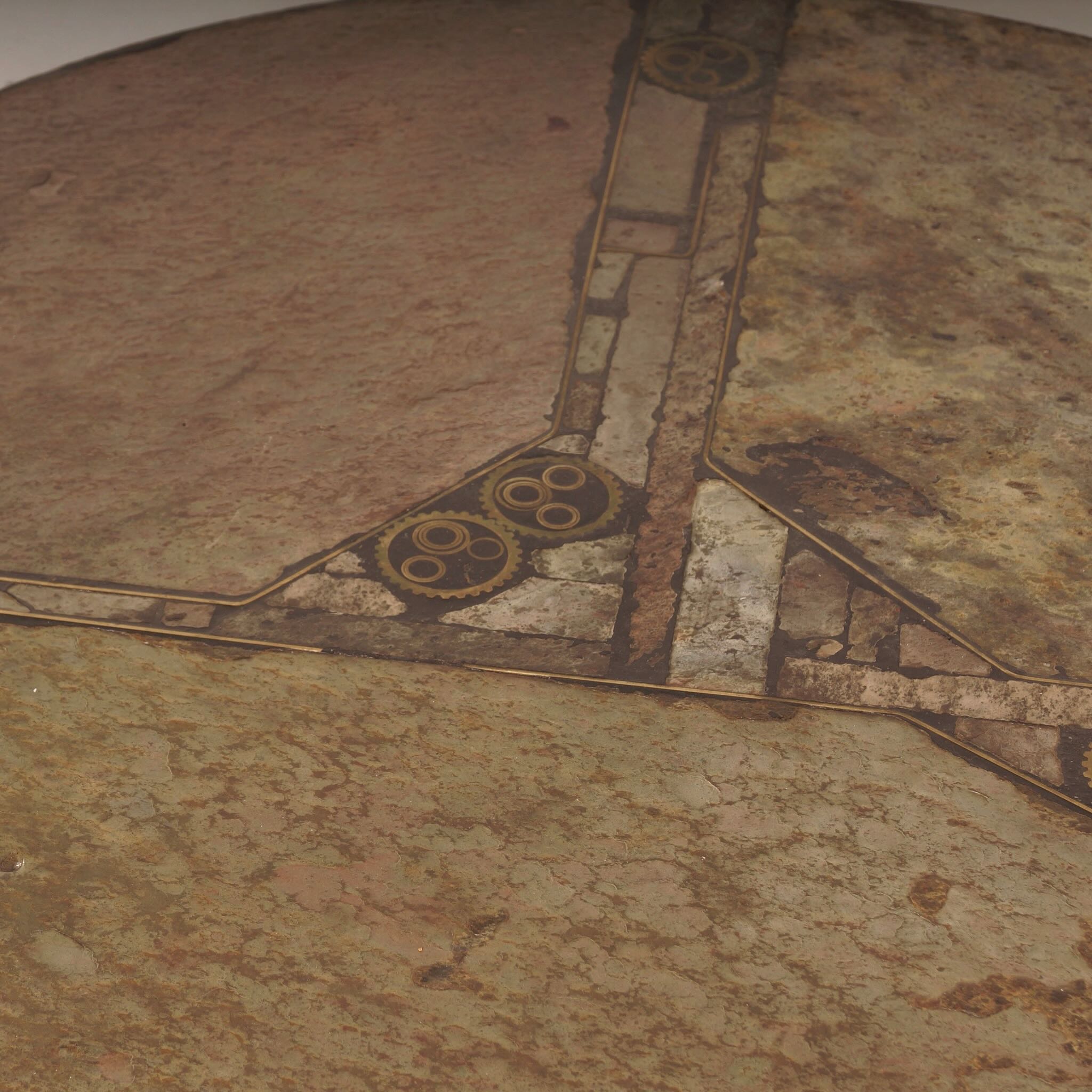 INCL. VAT ACCORDING TO THE MARGIN SCHEME (IF APPLICABLE)Kingma coffee table, a brutalist and handmade design by Marcus Kingma, was manufactured in 1994. Being the son of sculptor Paul Kingma, he grew up making these tables and later developed his own style aimed at the German market, making his designs rarer in the Netherlands. The round top consists of a playful composition of natural stone in various colours, bronze and concrete, artfully inlaid into a mosaic-like pattern. This gives the table a sharply defined brutalist character with a sculptural feel. The dimensions are h x w x d = 34.5 x 103 x 103 cm. The colours vary between brown (multicoloured), black and gold, adding depth to the design. The table is signed ‘M. Kingma 94’ (see photos).