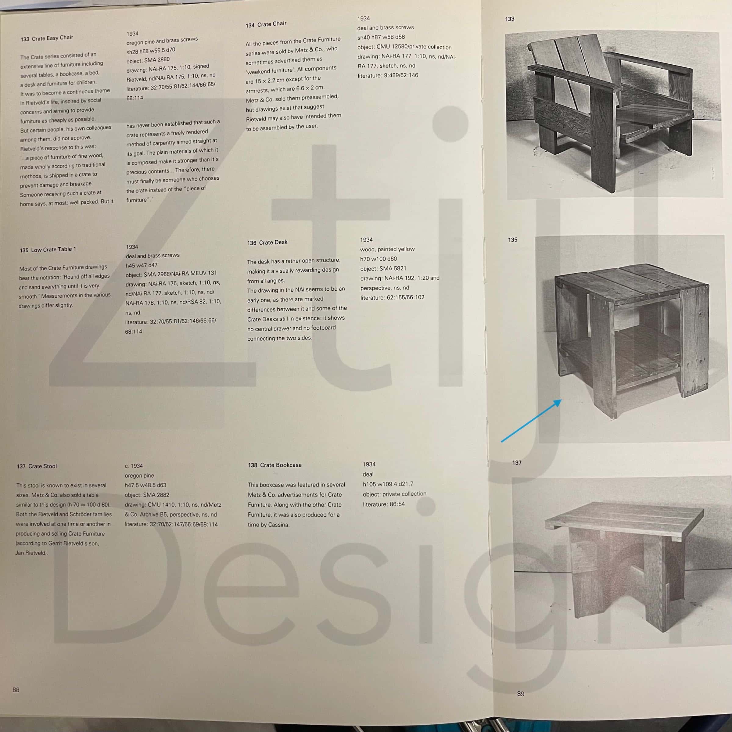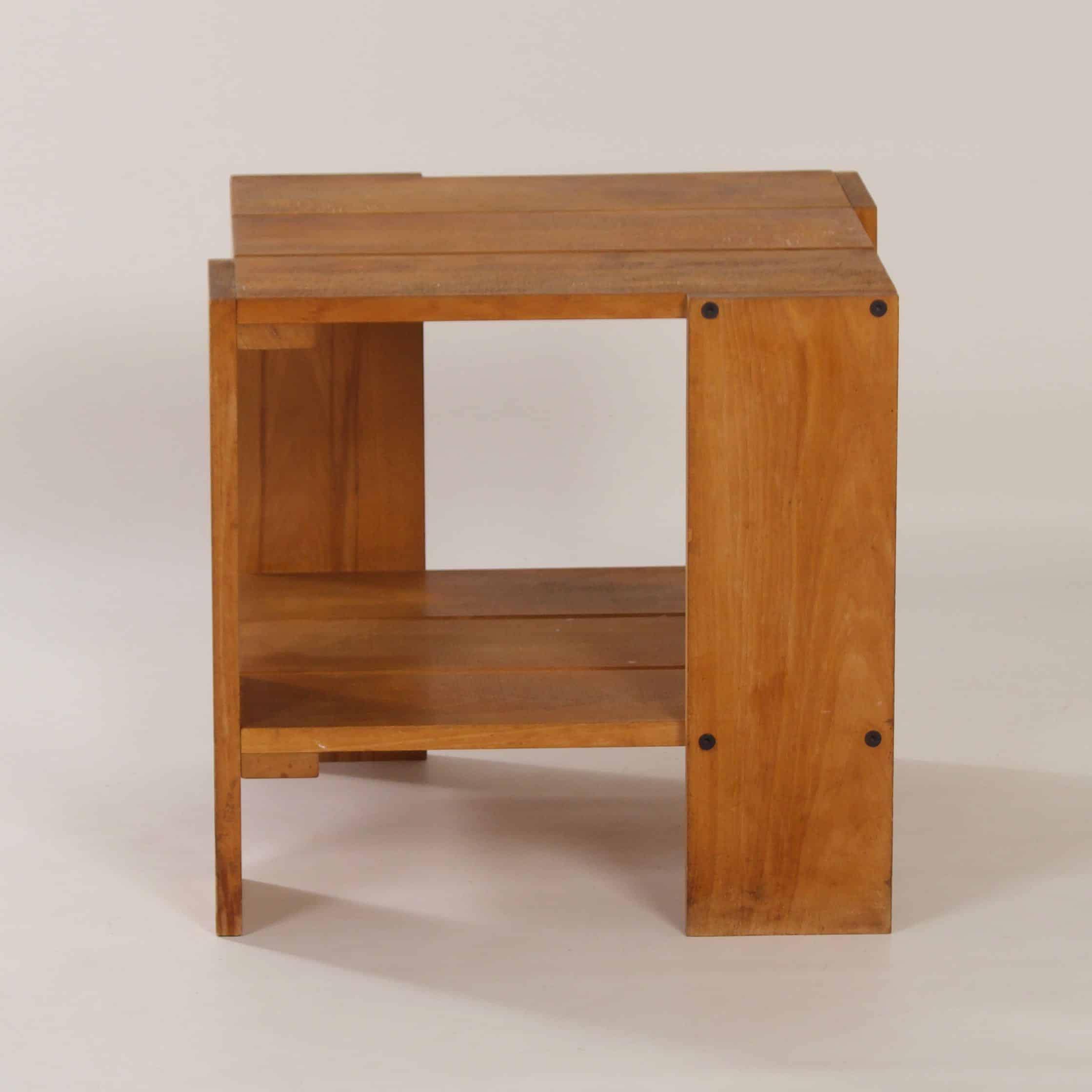 INCL. VAT ACCORDING TO THE MARGIN SCHEME (IF APPLICABLE)Low crate table 1 designed by Gerrit Thomas Rietveld in 1934 and made by Cassina in the eighties. Marked and numbered: Cassina, Meubelmakerij Rietveld, Adriaan van Ostadelaan 25, no. 40 (low number!). In 1934, Rietveld started experimenting with furniture made from wood that was used to make crates. Rietveld reasoned that furniture for transport was always packed in crates, which apparently consisted of stronger material than the furniture itself. So why not use that material to make a piece of furniture. This is how the first crate furniture was created. The standard dimensions of the crate of wood quoted, as it were, the composition of the furniture. The price is only for the table, not the chair. Source: the complete Rietveld furniture, publisher 010, pages 88 and 89.