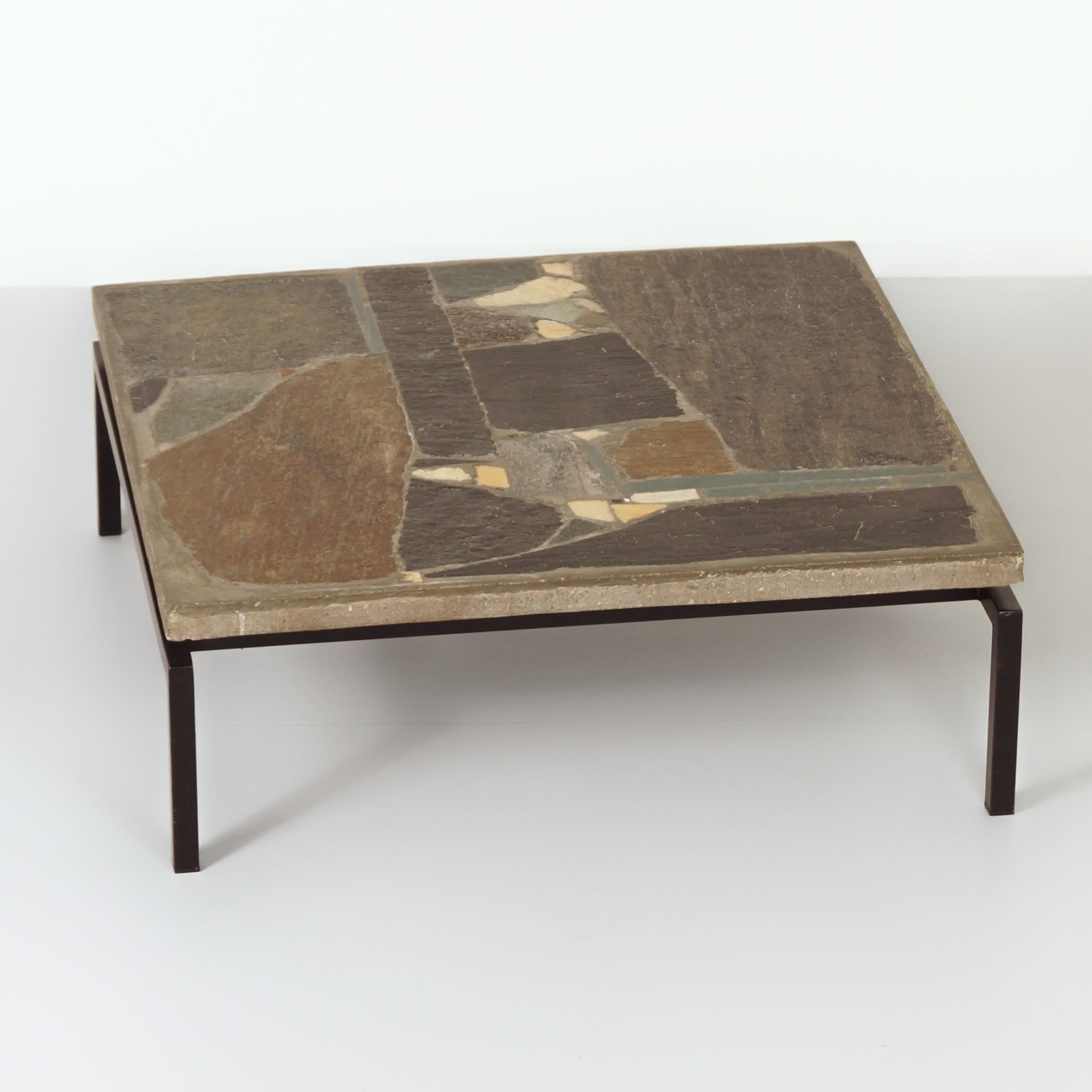 INCL. VAT ACCORDING TO THE MARGIN SCHEME (IF APPLICABLE)This Paul Kingma coffee table from 1964 is a rare brutalist design with a mosaic top, handcrafted from various types of natural stone, ceramics, and pebbles, embedded in concrete. The square top of 100 cm features a geometric pattern in blue, white, yellow, brown, black, and red, making the table a unique piece of artwork. This particular table is signed by the designer on both the top and bottom of the table (double signature). The coffee table fits perfectly in both modern and classic interiors, serving as a statement piece in the living room, study, or office. The robust design with hard materials like concrete and natural stone gives the table a warm, inviting appearance. The table’s dimensions are h x w x d = 34 x 100 x 100 cm, with the base made of black metal. The top is 4 cm thick, and the table weighs approximately 90 kg. Signed: Kingma – 1964 (see photo).
