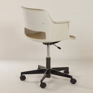 INCL. VAT ACCORDING TO THE MARGIN SCHEME (IF APPLICABLE)Gispen Desk chair Model 2712 with armrests designed by André Cordemeyer for Gispen, 1970s. The shell is made of fiberglass reinforced polyester and the base of painted sheet steel. The height can be adjusted by means of a lever (mechanical height adjustment instead of a gas spring) and the base is equipped with castors. This chair belongs to the series BZ (better sitting). The condition of this mid-century office chair is still very good; no tears or holes in the vinyl upholstery. Material: metal, polyester, fiberglass and vinyl. Colours: white, black, silver and beige upholstery. Dimensions: h x w x d = 83 x 61 x 61 and the seat height is adjustable from 38 to 51 cm. Source: Gispen book NAI. page 140.