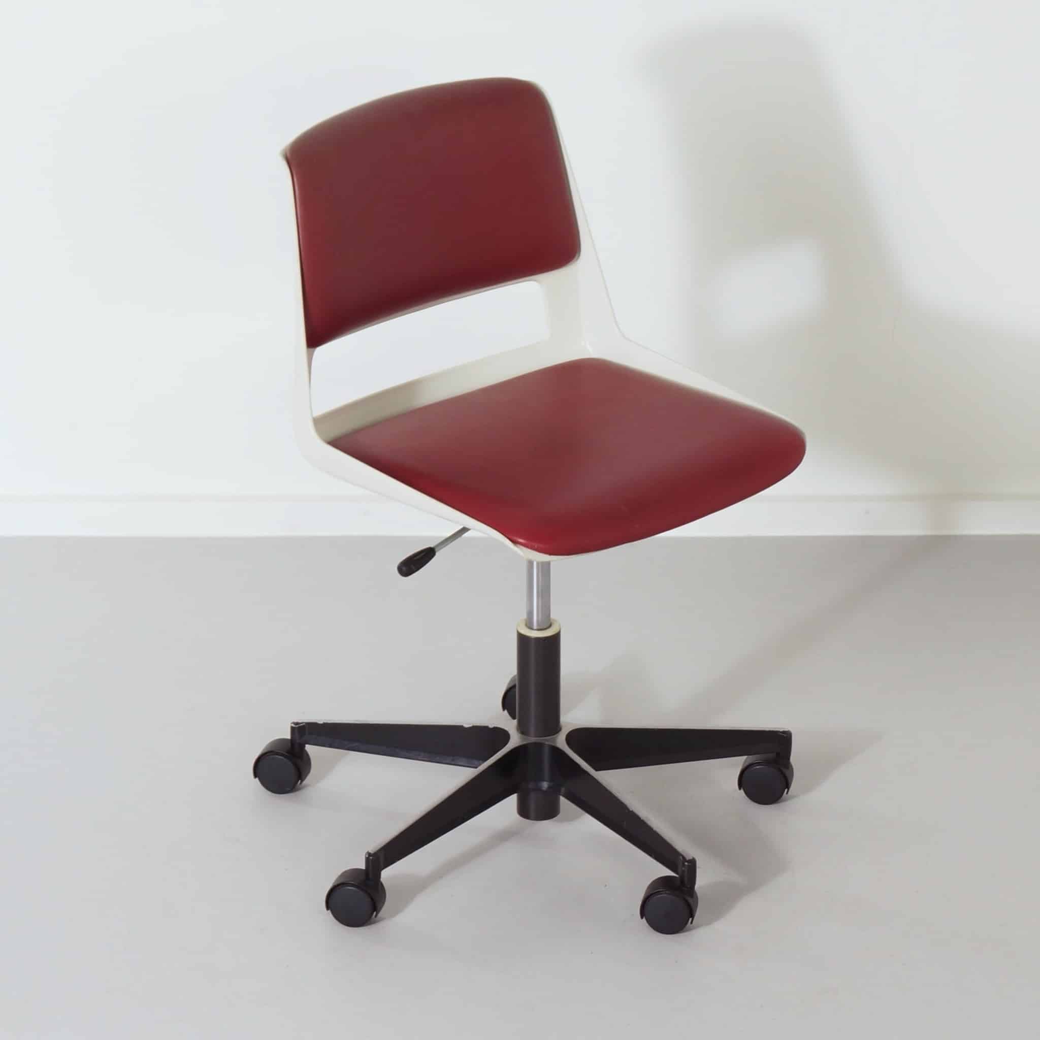 The condition of this vintage office chair is still good, with some slight signs of use, such as a small hole in the skai upholstery, some discolouration and a few small stains (see photos). Upon request, we can reupholster the chair. The chair has a dark red colour, which makes it a unique and striking design for any interior. The dimensions are 83 cm high, 61 cm wide, 61 cm deep, and the seat height is adjustable from 38 to 51 cm.