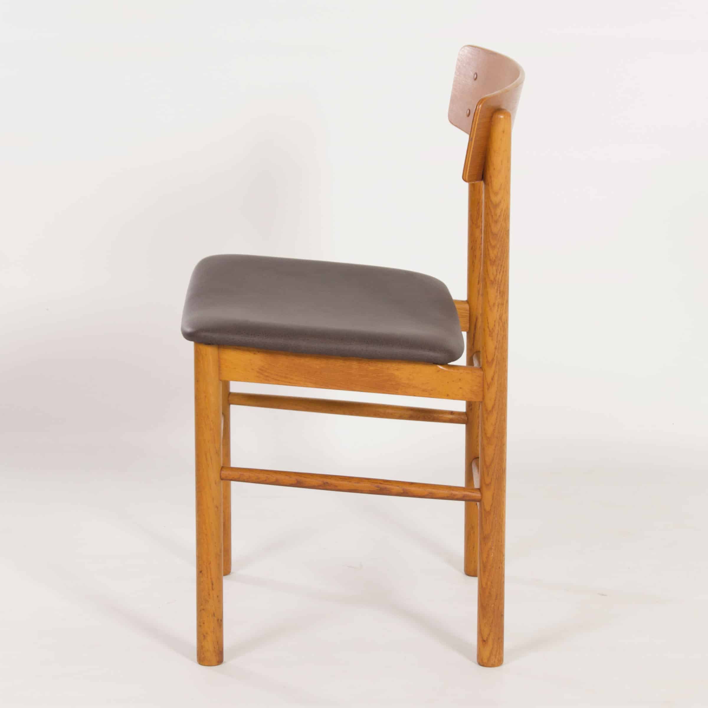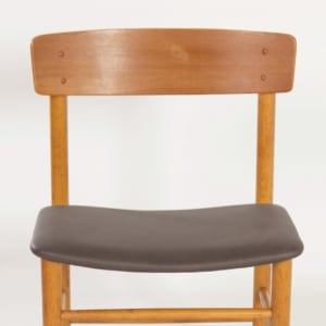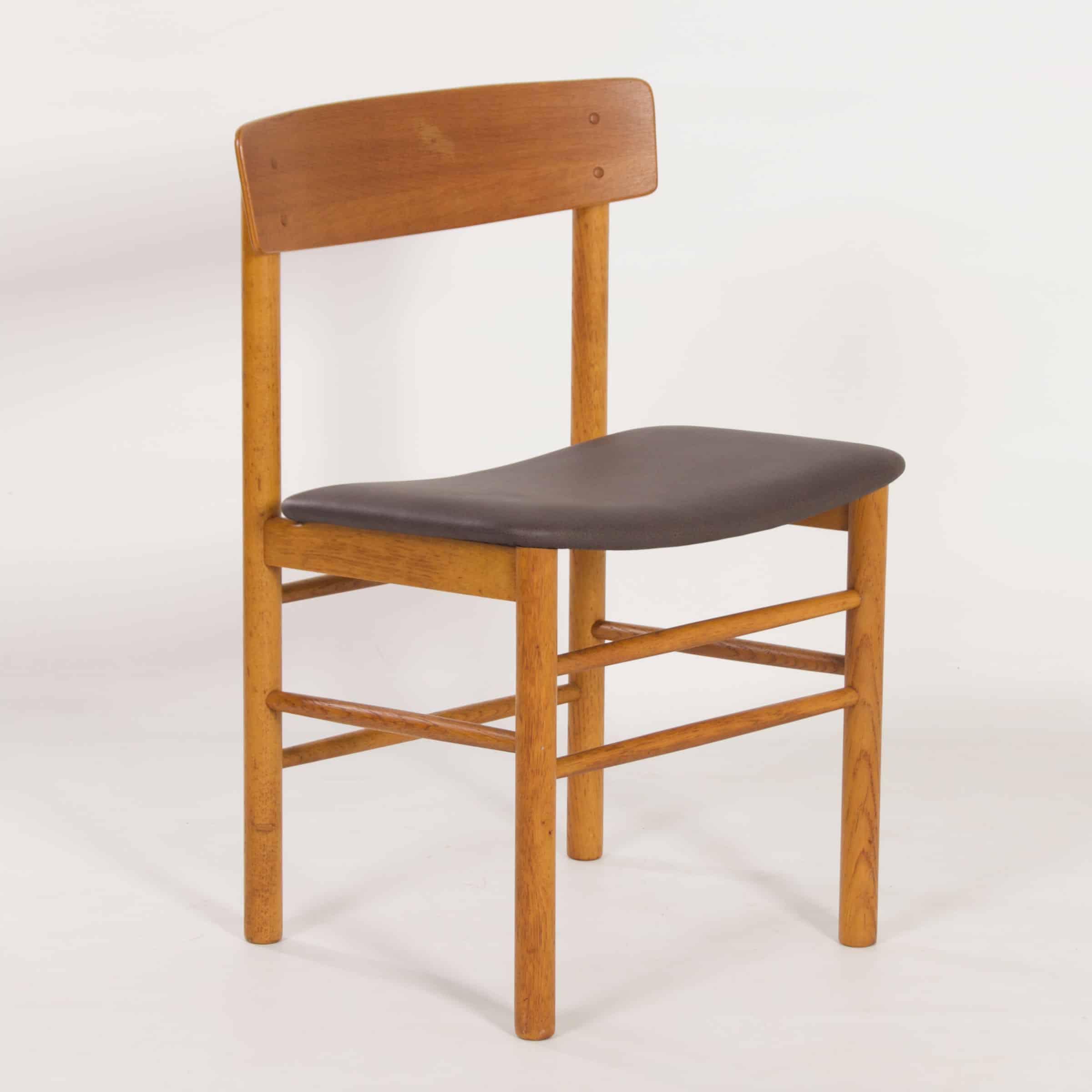 Danish Farstrup chair from the sixties. This teak chair has been reupholstered with new foam and brown leather. Marked: Farstrup, Denmark. This model is beautiful because of its simplicity and shows many similarities with the ‘The peoples chair’ by Borge Mogensen. Material: Solid teak wood frame and a wooden seat covered with foam and brown leather. The condition of the frame is still very sturdy and has normal signs of wear and the leather upholstery is new. Dimensions: h x w x d = 77 x 50 x 46 cm and the seat height is 45 cm. Marked: Made in Denmark by Farstrup (see photos).