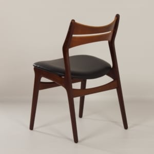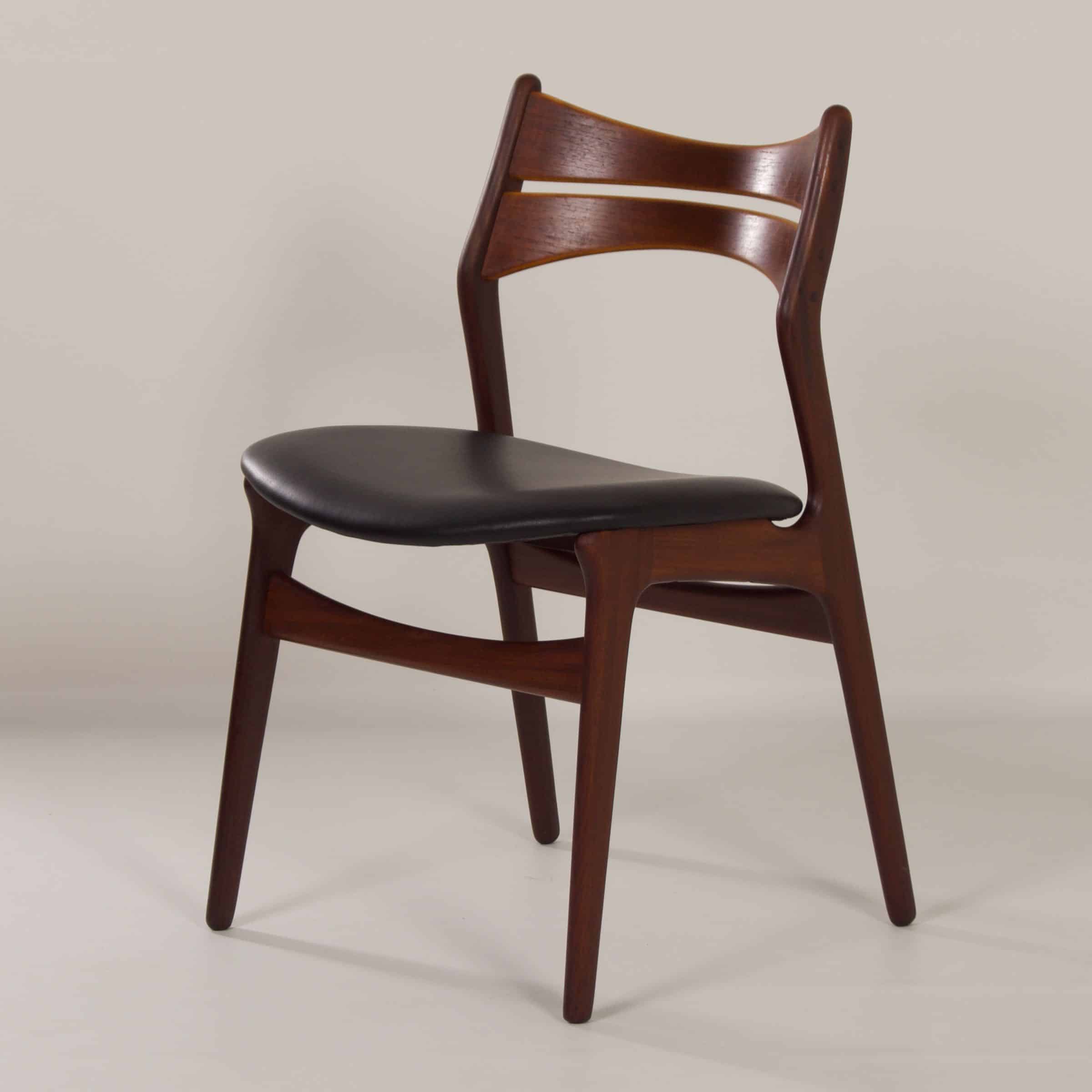 INCL. VAT ACCORDING TO THE MARGIN SCHEME (IF APPLICABLE)Model 310 teak dining chairs in black leather designed by Erik Buck for CHR. Christensens Møbelfabrik I/S Vamdrup, 1960s. This set of chairs has been reupholstered and provided with new foam and black leather. Dimensions: h x w x d = 81 x 52 x 52 and the seat height is 47 cm. Material: teak wood and leather. Three of the four chairs are marked (see photo) CHR. Christensens Mobelfabrik I/S Vamdrup Design Erik Buck, made in Denmark.