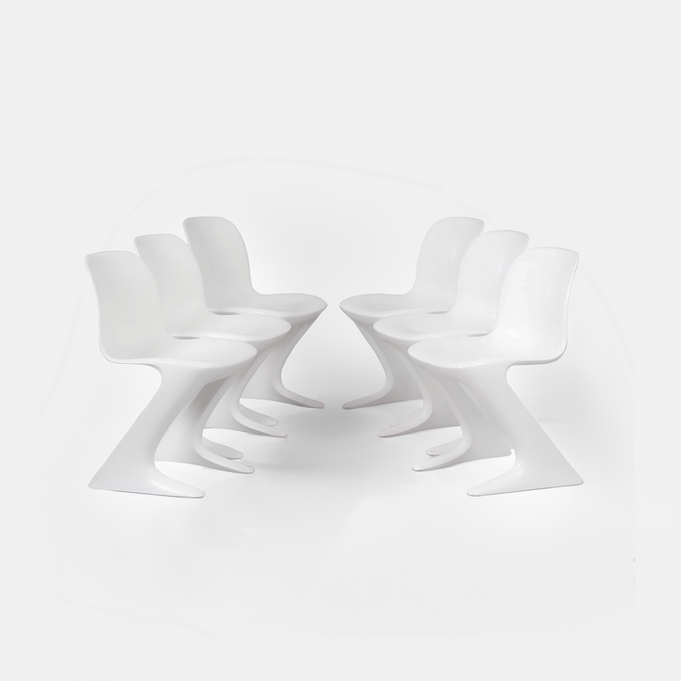 Set of six white kangaroo chairs designed by Ernst Moeckl for Horn Collection, West Germany in 1968. These stackable chairs from the early 1970s are called both kangaroo chair and Z-chair due to the shape of the legs. These chairs were very progressive for the time due to their space age shape and use of materials. They are made of Baydur (polyurethane-duromere), refined with high quality DD Lacquer. The material is light, strong and durable. The condition is still good considering the age with normal signs of use, such as scratches and some paint damages (see photos). The construction of the chairs is still very good and sturdy. Dimensions: h x w x d = 75 x 45 x 53 cm. The seat height is 42 cm.