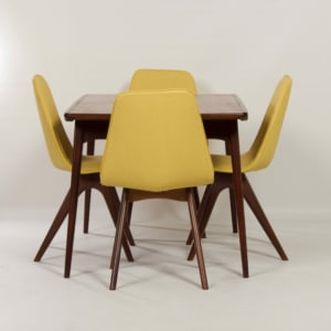 INCL. VAT ACCORDING TO THE MARGIN SCHEME (IF APPLICABLE)Set of four teak dining chairs with yellow vintage Viper skai made at Meubelfabriek G.J. van Os N.V. in Culemborg in the 1950s. The condition of these vintage dining chairs is good; they have recently been reupholstered once. Material: teak, wood and yellow viper vintage skai upholstery. Dimensions: h x w x d = 88 x 51 x 56 cm and the seat height is 47 cm. The price is only for the 4 chairs, without the table.