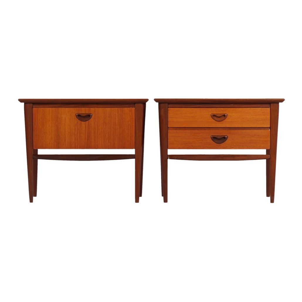 INCL. VAT ACCORDING TO THE MARGIN SCHEME (IF APPLICABLE)Set teak nightstands designed by Louis van Teeffelen for Wébé furniture in the 60s. Considering the age, these vintage bedside tables are still in good condition; some discoloration at the top from a rug (see photos). Source; Catalog Wébé, Louis van Teeffelen 1962. The price is for the set.