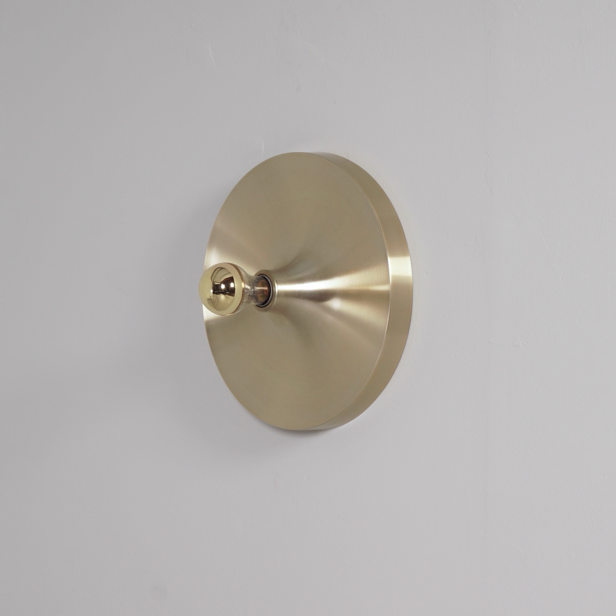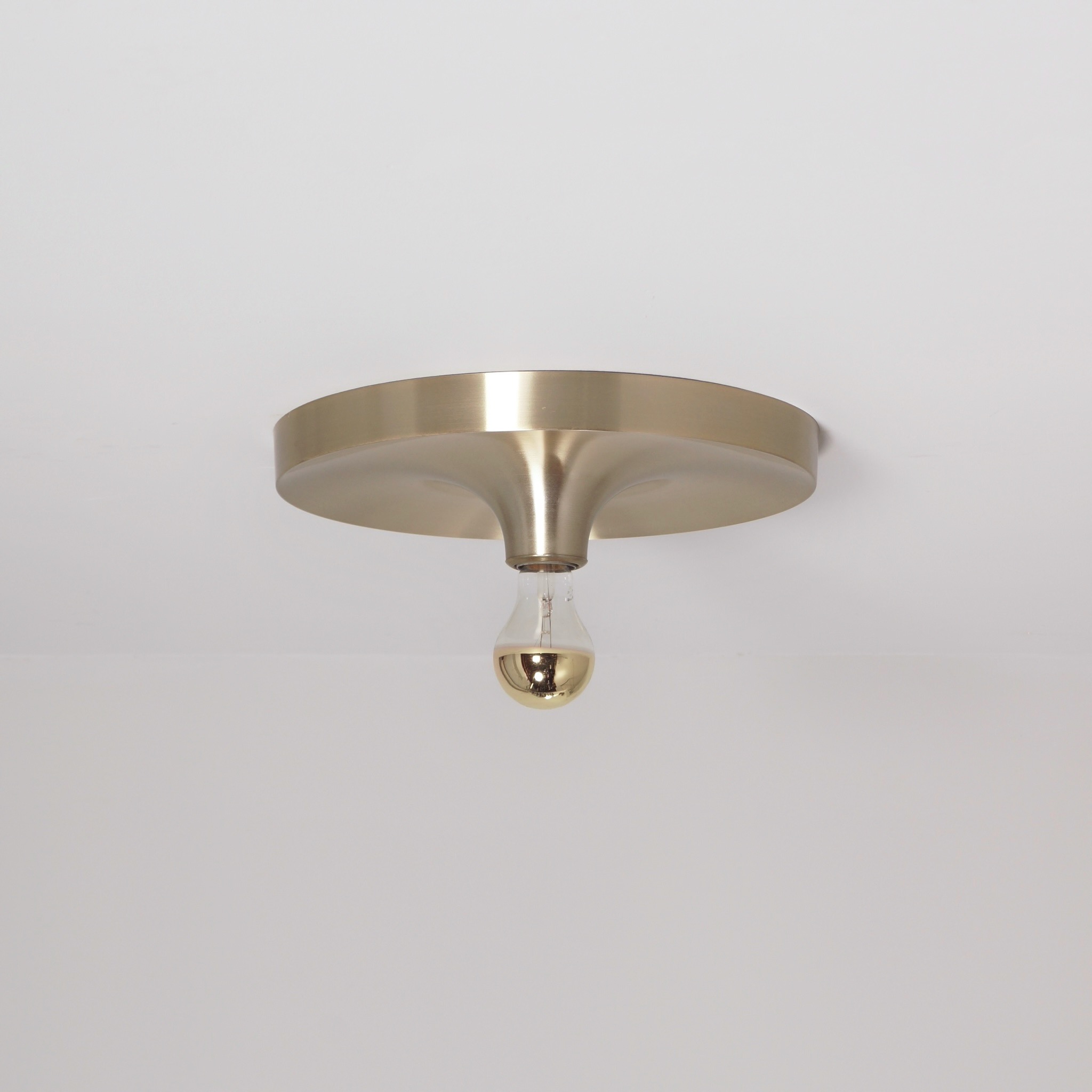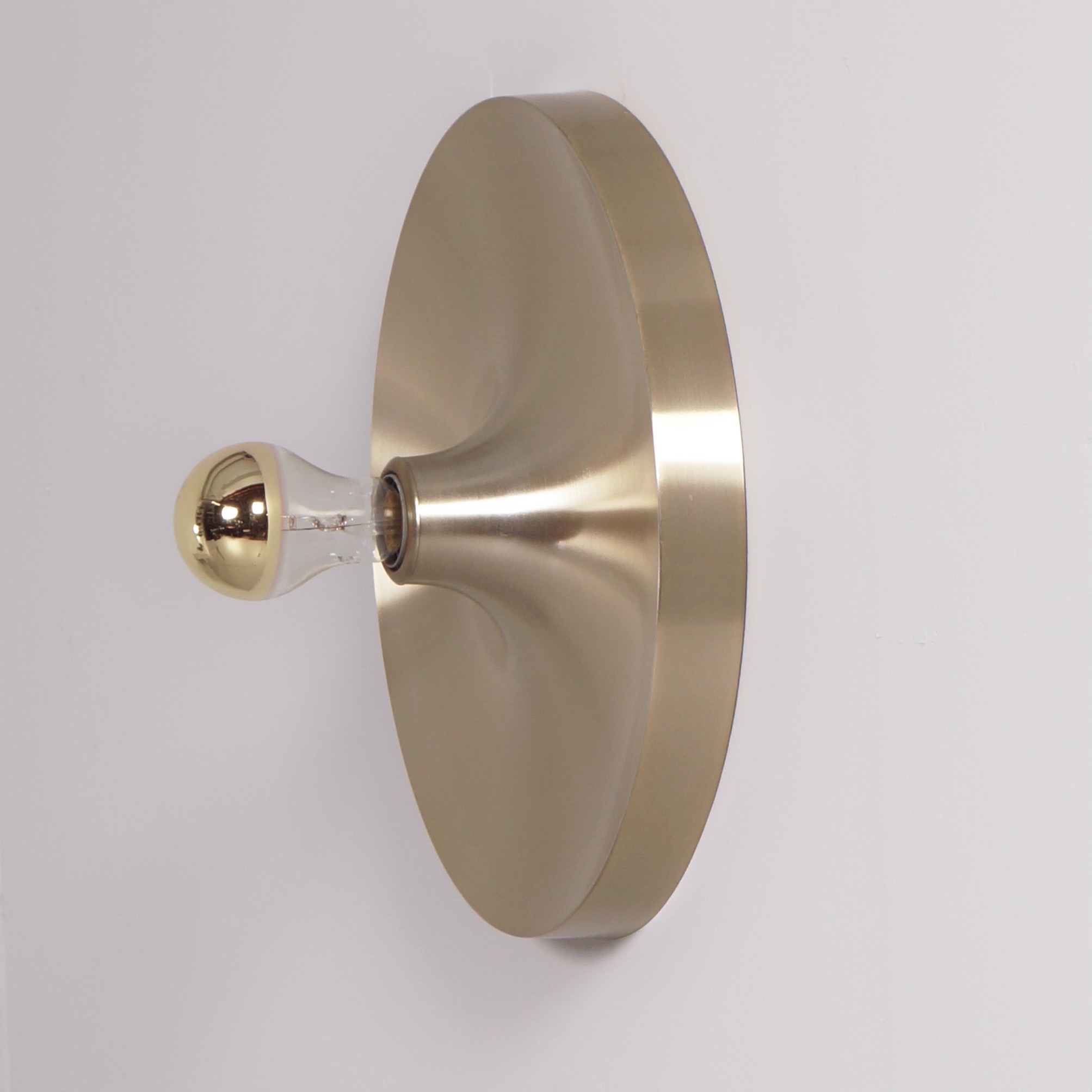 The lamp is made of brass-coloured anodised aluminium and can be mounted on either the ceiling or the wall. Its construction consists of a broad disc with a tapered centre, a characteristic detail of TEKA models from this period. Dimensions: 35 × 9 (H) cm / 13.8 × 3.5 (H) in (measured without the gold-coloured bulb). Marked: TEKA.