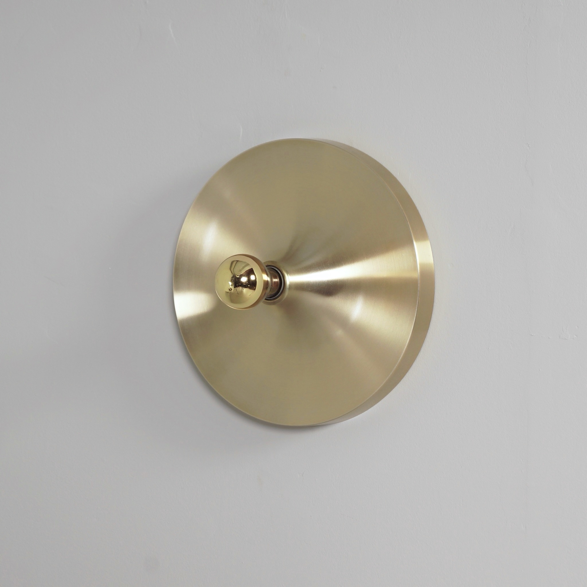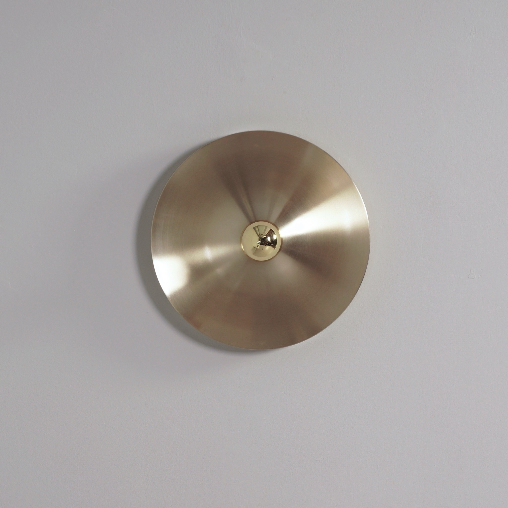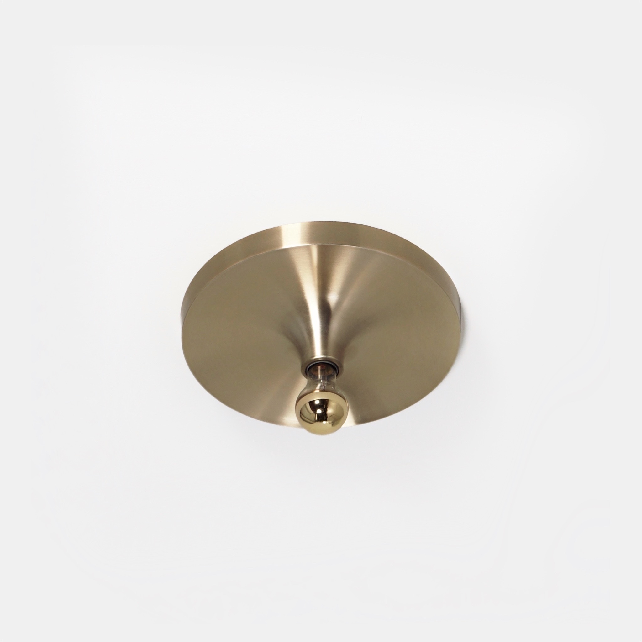The lamp is made of brass-coloured anodised aluminium and can be mounted on either the ceiling or the wall. Its construction consists of a broad disc with a tapered centre, a characteristic detail of TEKA models from this period. Dimensions: 35 × 9 (H) cm / 13.8 × 3.5 (H) in (measured without the gold-coloured bulb). Marked: TEKA.