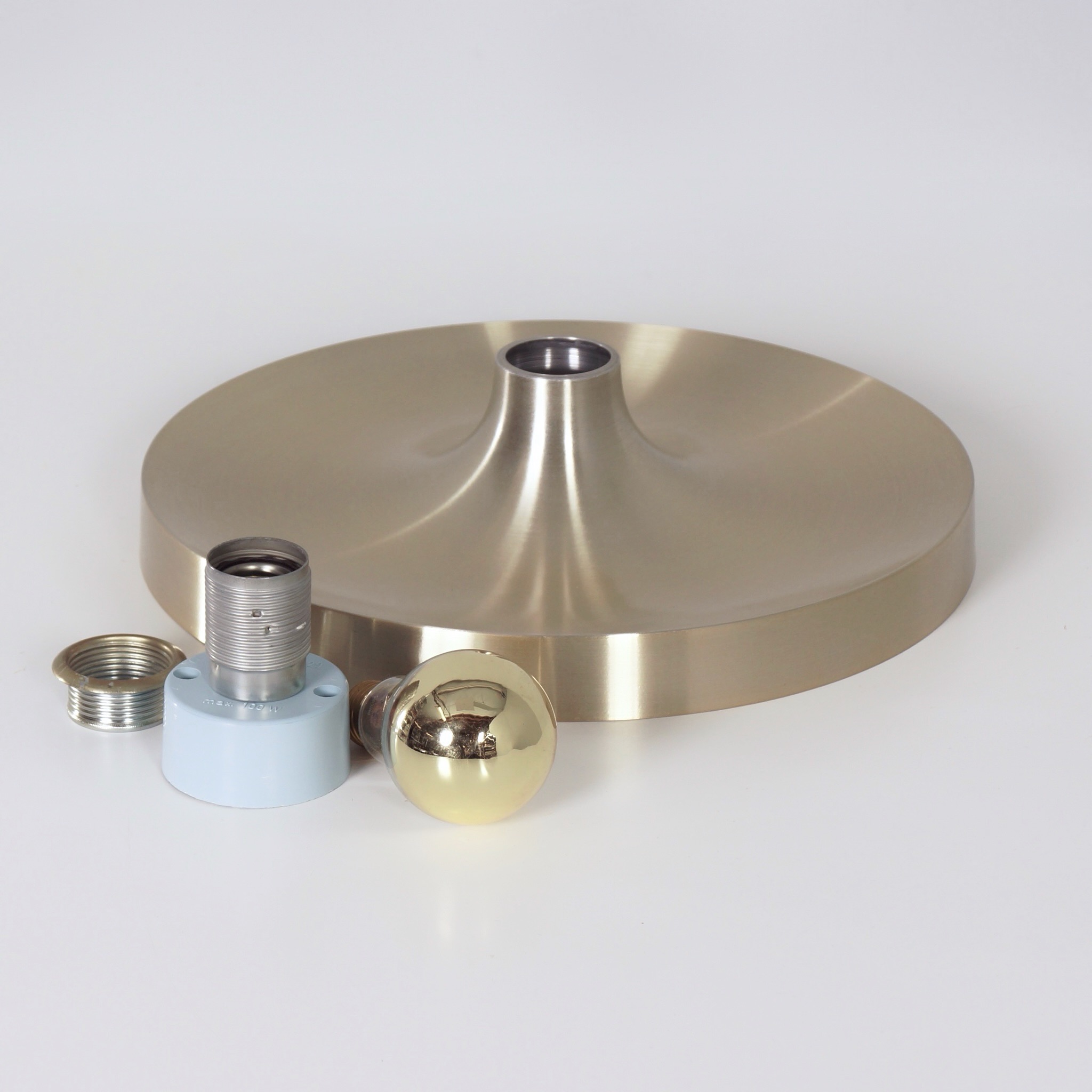 Space Age ceiling light by TEKA in brass-coloured aluminium, featuring a circular disc-shaped shade with a gentle conical transition towards the central E27 socket. The brushed aluminium highlights the form and reflects the design language of the 1970s.