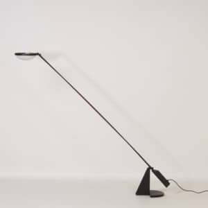 INCL. VAT ACCORDING TO THE MARGIN SCHEME (IF APPLICABLE)Floor lamp called “Truck” designed by Marco Borgna for the New Society in 1978. The “Truck”, is an adjustable floor lamp with a special mechanism that allows the lamp to tilt and the reflector to remain horizontal. This was very special for that time. The lamp has a small fitting (E14). Possibly easy to convert to LED with a different cord dimmer. Material: Metal and glass. Color: Black and transparent. Dimensions adjustable: h x w x d = 145- 192 x 37 x 30 cm. Source: Interni Annual, 1984. The price is only for the lamp, not the chair.