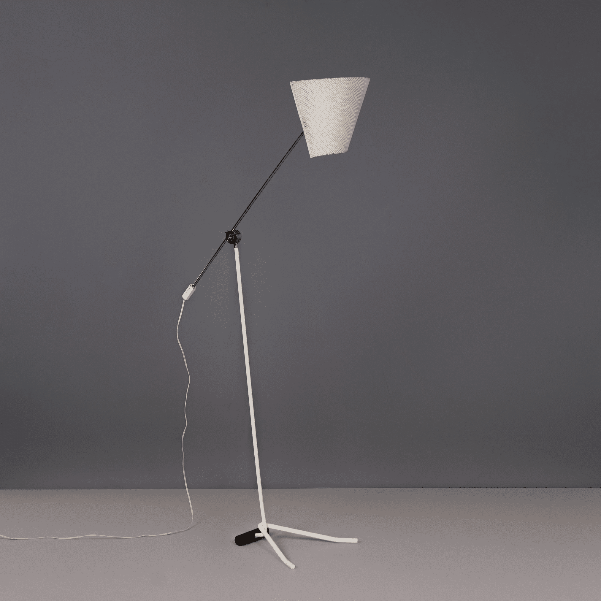 incl. BTW (indien van toepassing) volgens de margeregelingArtiforte floor lamp Model L3 designed by H. Fillekes in 1955. This is a very rare floor lamp from the then Rotterdam company Artiforte at Insulindestraat 222 (not to be confused with the furniture company Artifort). The company Artiforte already existed before Artifort started using this name. This mid-century floor lamp has a special leg, an adjustable rod arm with small counterweight and an adjustable perforated shade with the original perspex diffuser behind it! The condition is still good with normal signs of age and use; the stand was professionally repainted once, the hood is still original. Color: white, silver and black. Material: metal, nickel, perforated metal and perspex. Dimensions: adjustable, h x w x d = 155 x 105 x 38 cm. Source: advertisement from monthly magazine Goed Wonen 4 April, 1955, image XV (see photo). Collectors item, rare find!