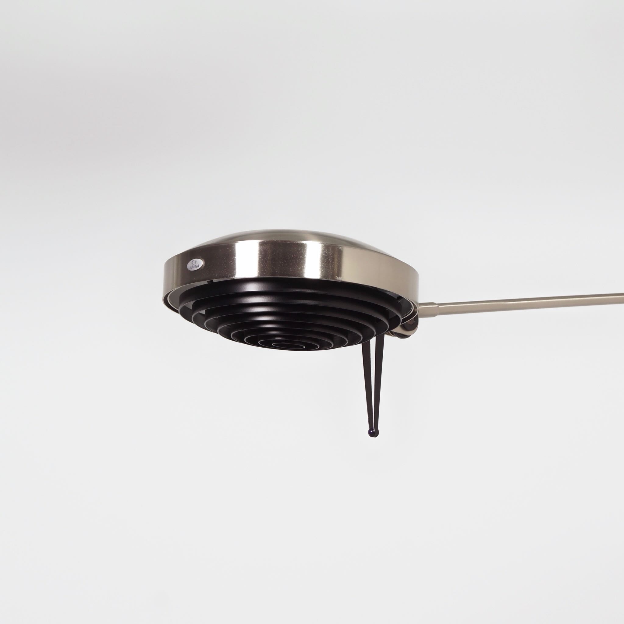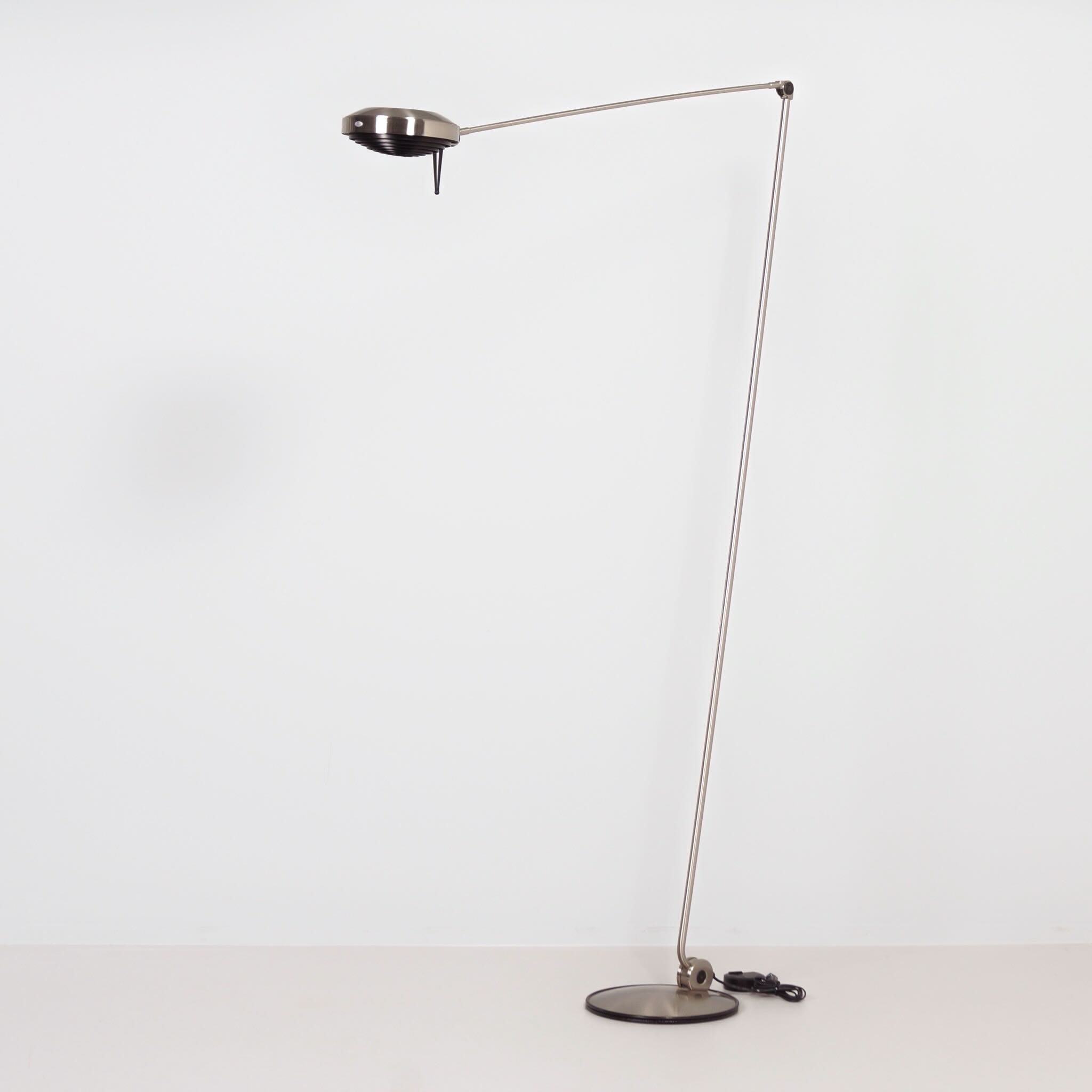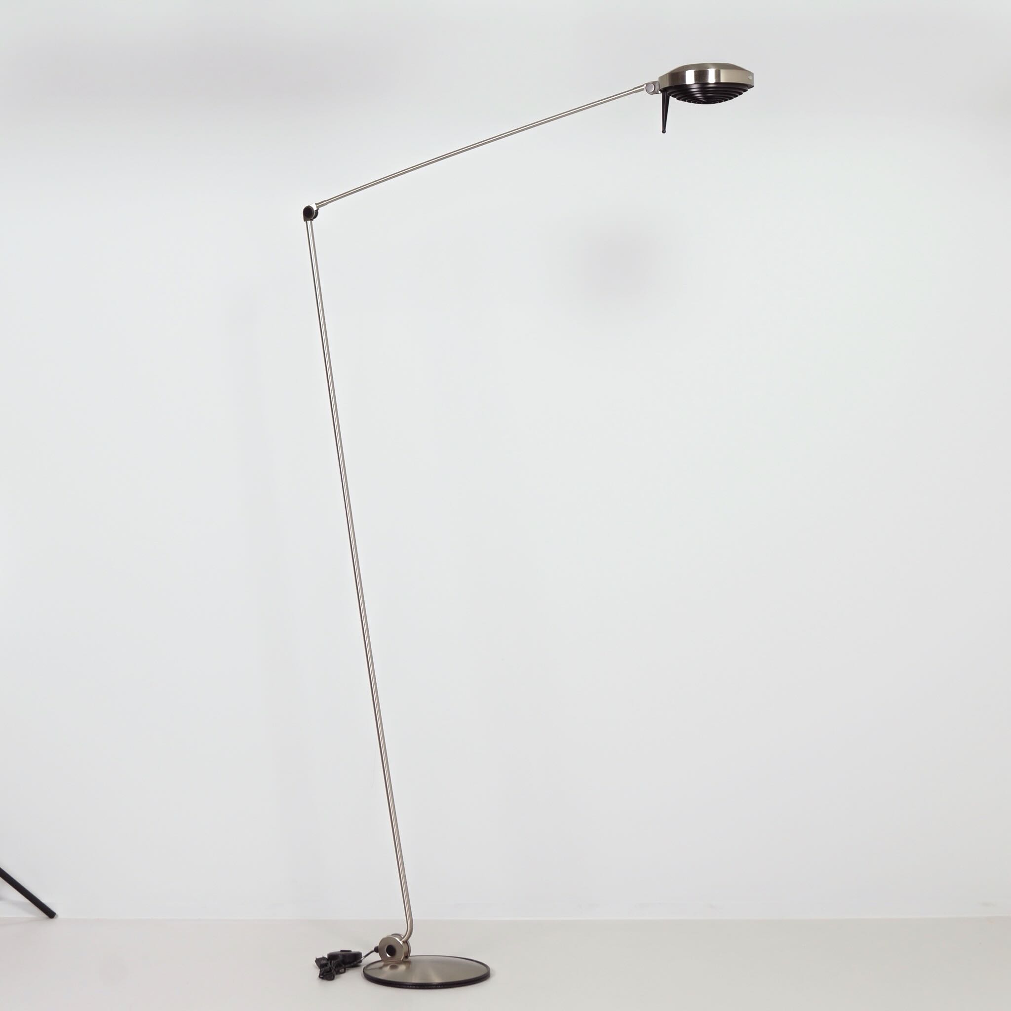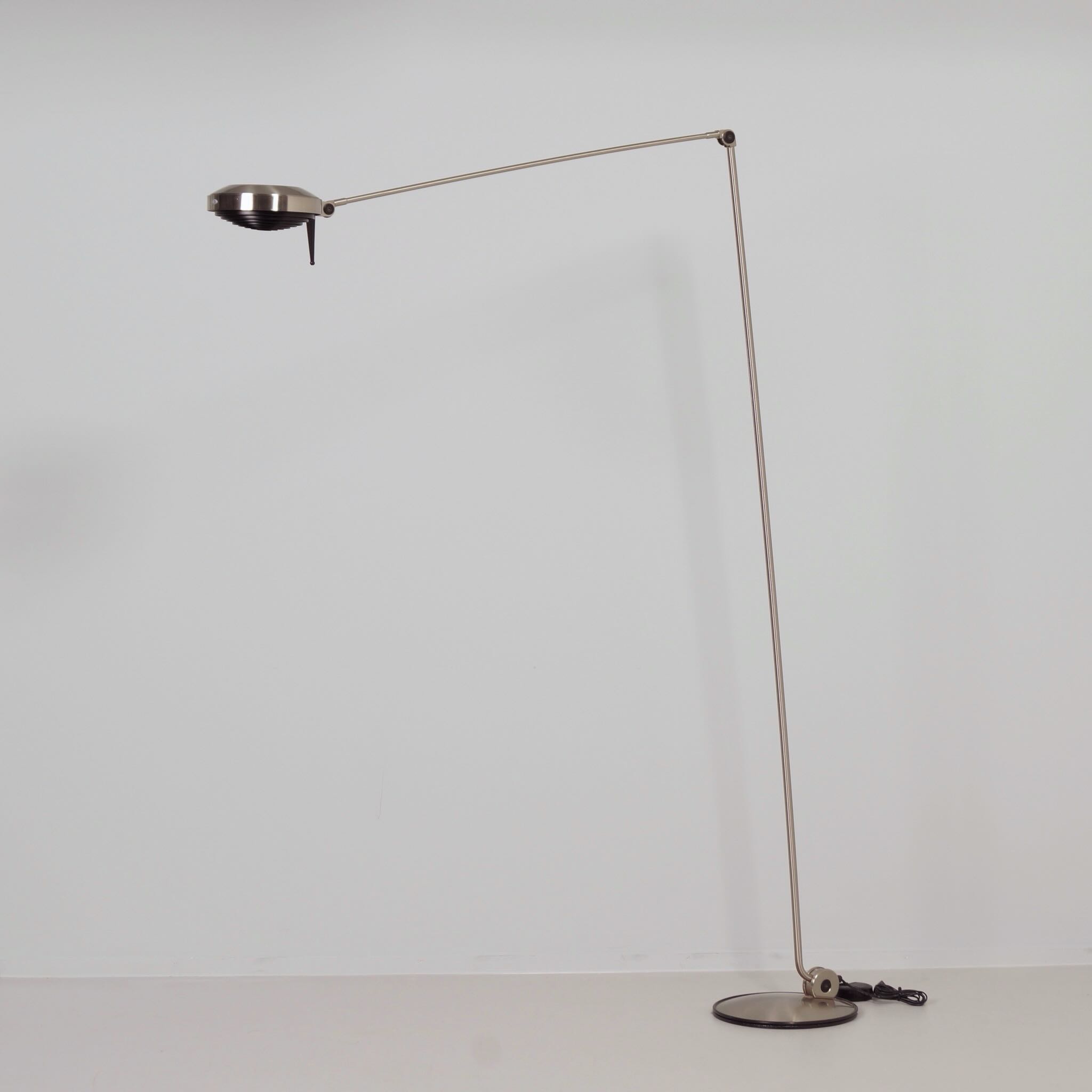 The design dates from 1984 by Tommaso Cimini and was produced by Lumina in the 1990s. The Elle 2 has a double articulated arm, an anti-glare grid and an cord dimmer. Made of metal with a nickel finish, dimensions 104 x 34 x 200 (H) cm, shade diameter 23 cm, base diameter 34 cm. Marked: Lumina.