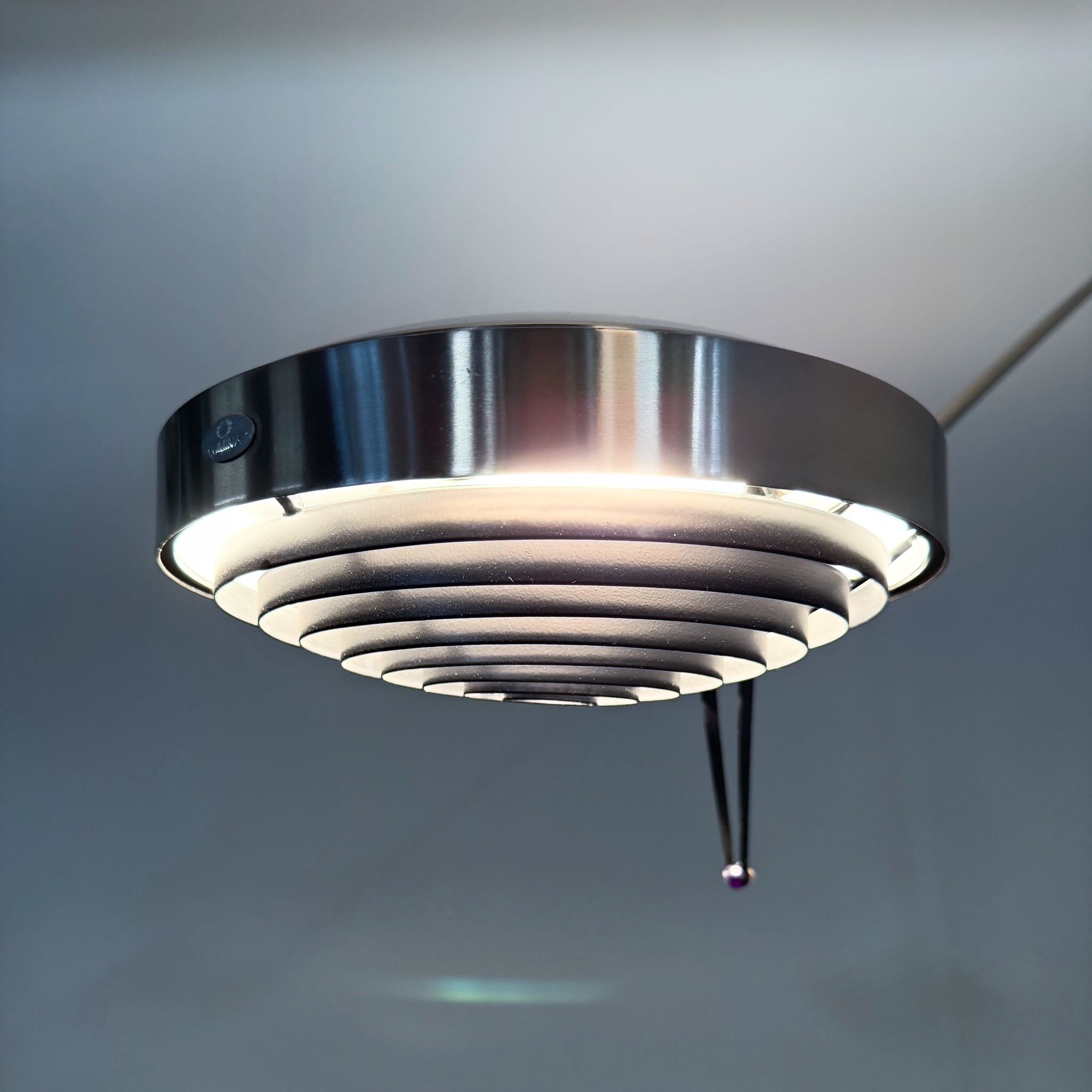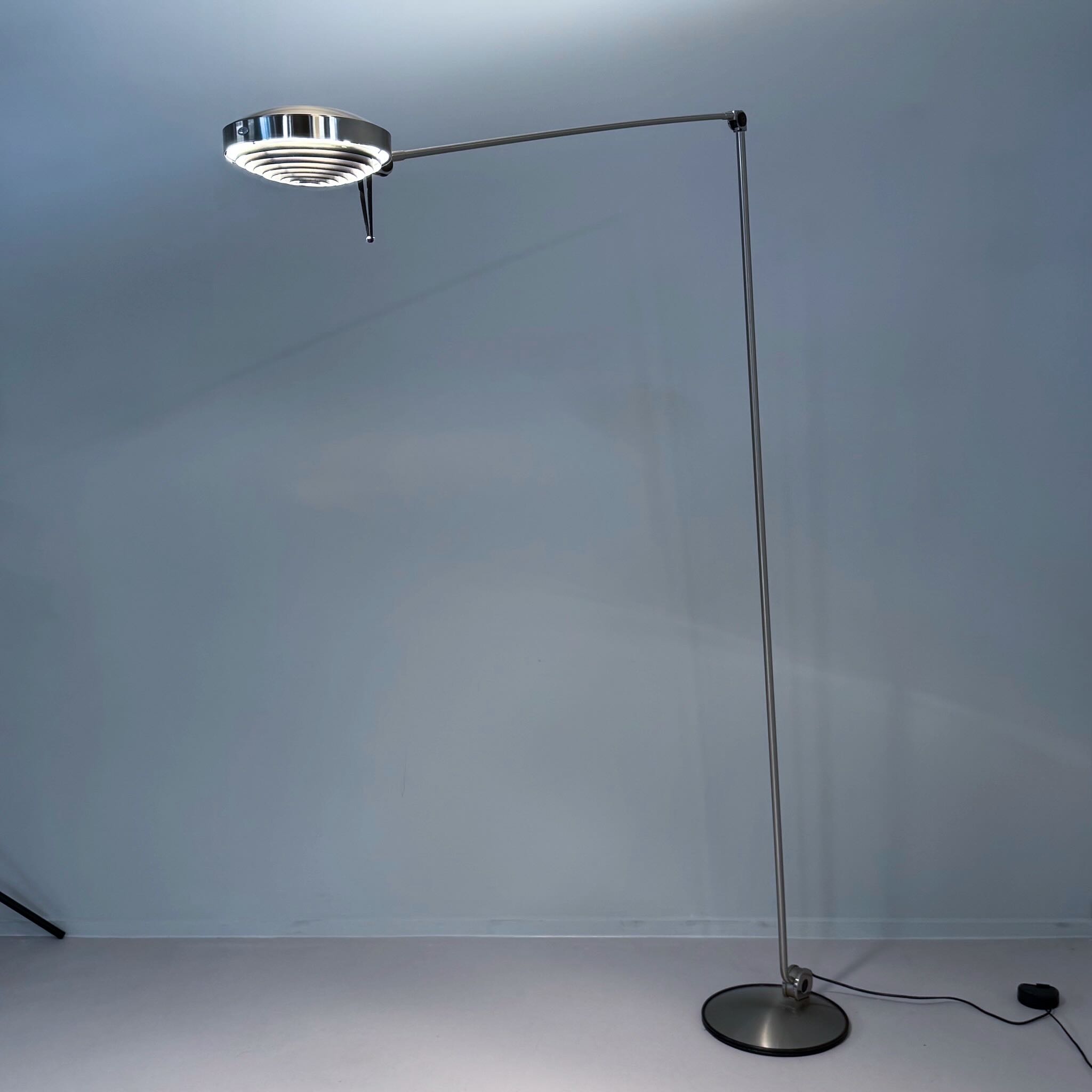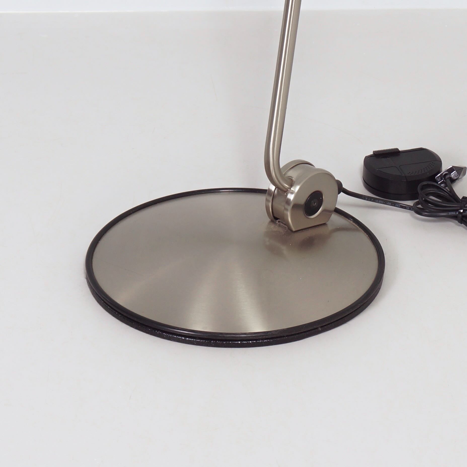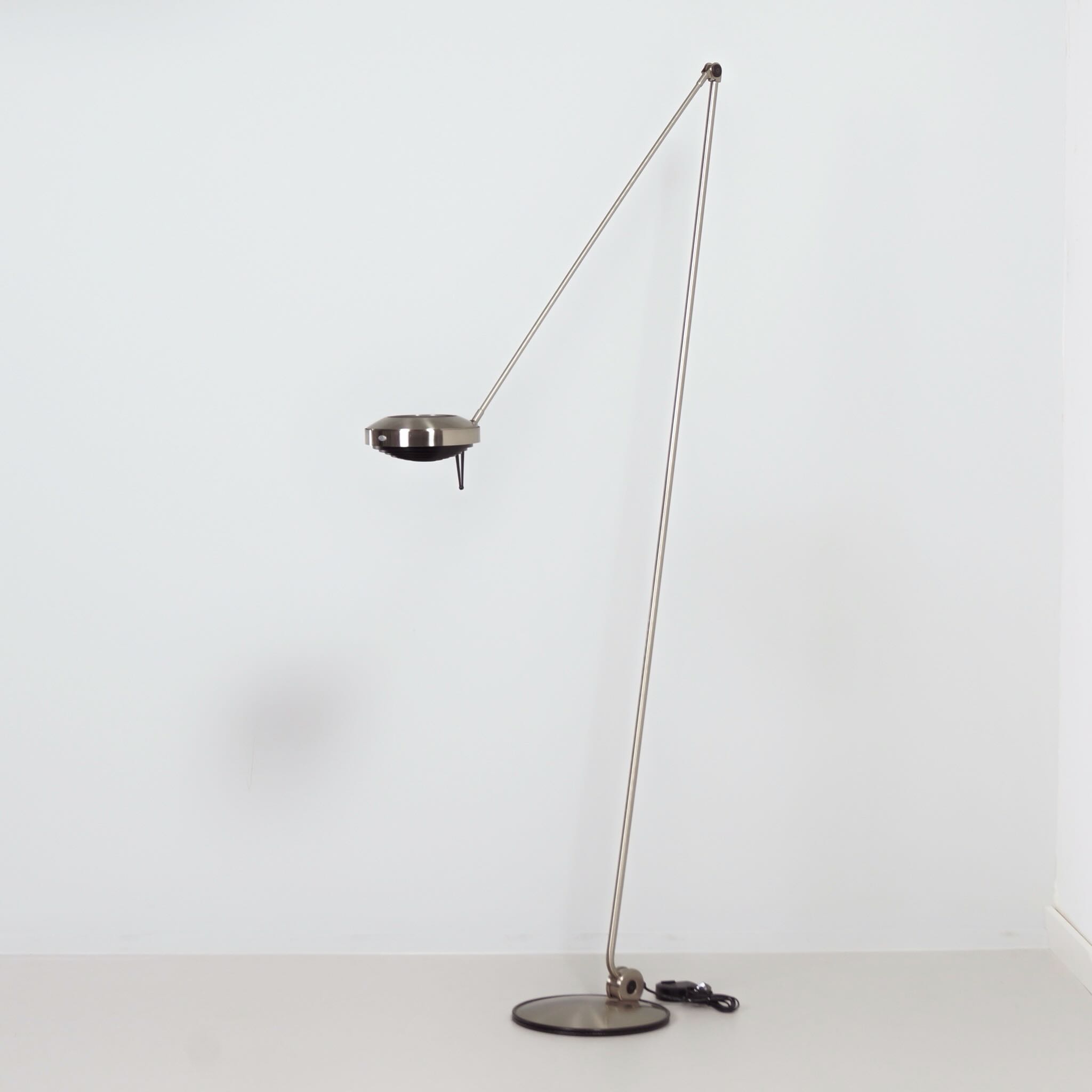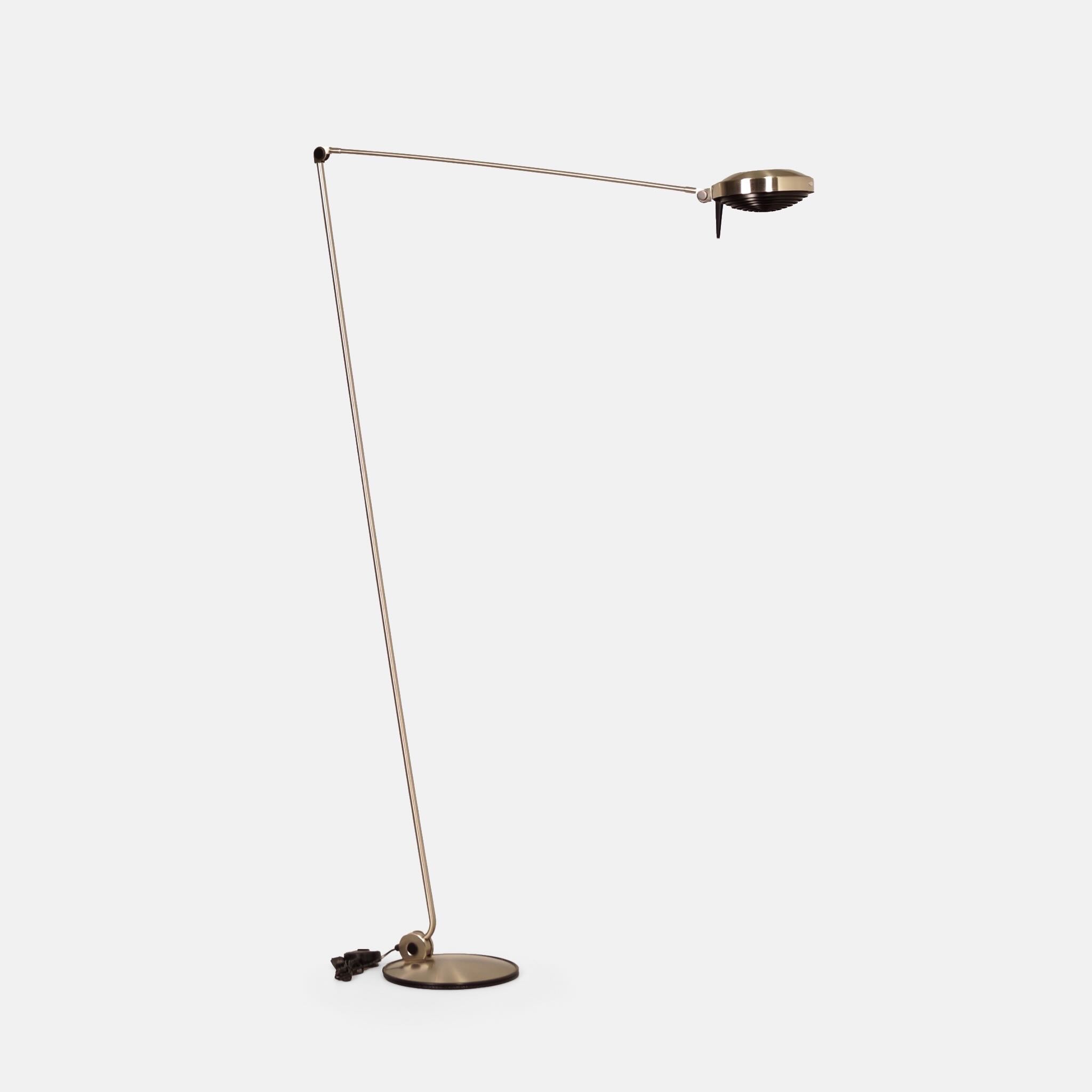 The design dates from 1984 by Tommaso Cimini and was produced by Lumina in the 1990s. The Elle 2 has a double articulated arm, an anti-glare grid and an cord dimmer. Made of metal with a nickel finish, dimensions 104 x 34 x 200 (H) cm, shade diameter 23 cm, base diameter 34 cm. Marked: Lumina.