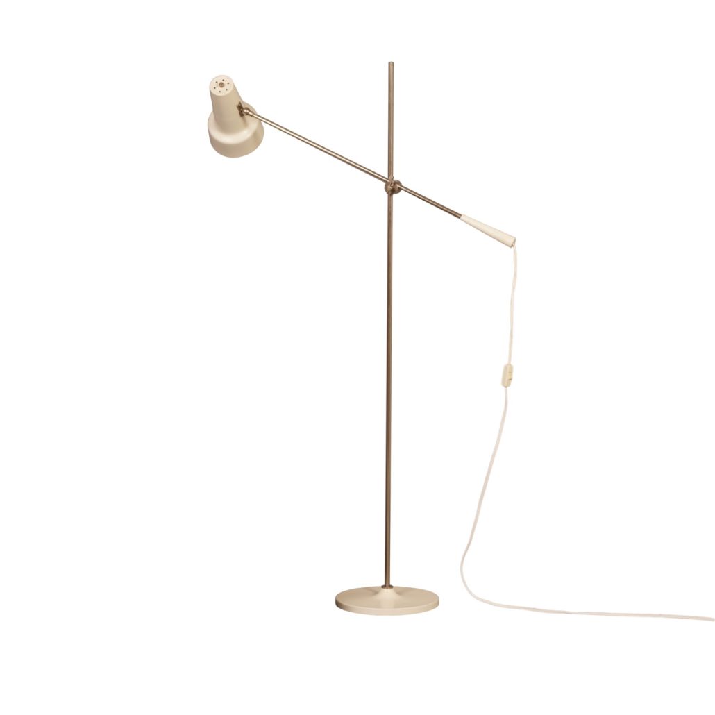 Adjustable white Hagoort floor lamp model 329 designed by Willem Hagoort for Hagoort lamps Rotterdam in the early sixties. This vintage floor lamp is adjustable in different directions for direct or indirect lighting. Considering its age this vintage floor lamp is still in good condition, some traces of use and wear (some small dents in the foot). The wiring has been checked by an electrician. Dimensions: h x w x d = 142 x 90 x 27 cm. The diameter of the cap is 14 cm and the diameter of the foot 27 cm. Marked: W. Hagoort. Source: catalogue goed wonen 1964, page 96.