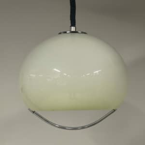 INCL. VAT ACCORDING TO THE MARGIN SCHEME (IF APPLICABLE)Guzzini hanging lamp “Jolly” designed by Luigi Massoni for Harvey Guzzini in 1968. This seventies pendant has a pull mechanism and is therefore adjustable in height. The yellow green glow on the underside of the hood gives a beautiful appearance (see photos). The condition is still original and good. The black ceiling cap has a small hole for the connecting (see photo). The wiring has been checked by an electrician. Dimensions of shade: h x d = 37 x 39 cm. The height is adjustable from 75 to 190 cm. Marked: iGuzzini (see photo) and on the suspension 1974.