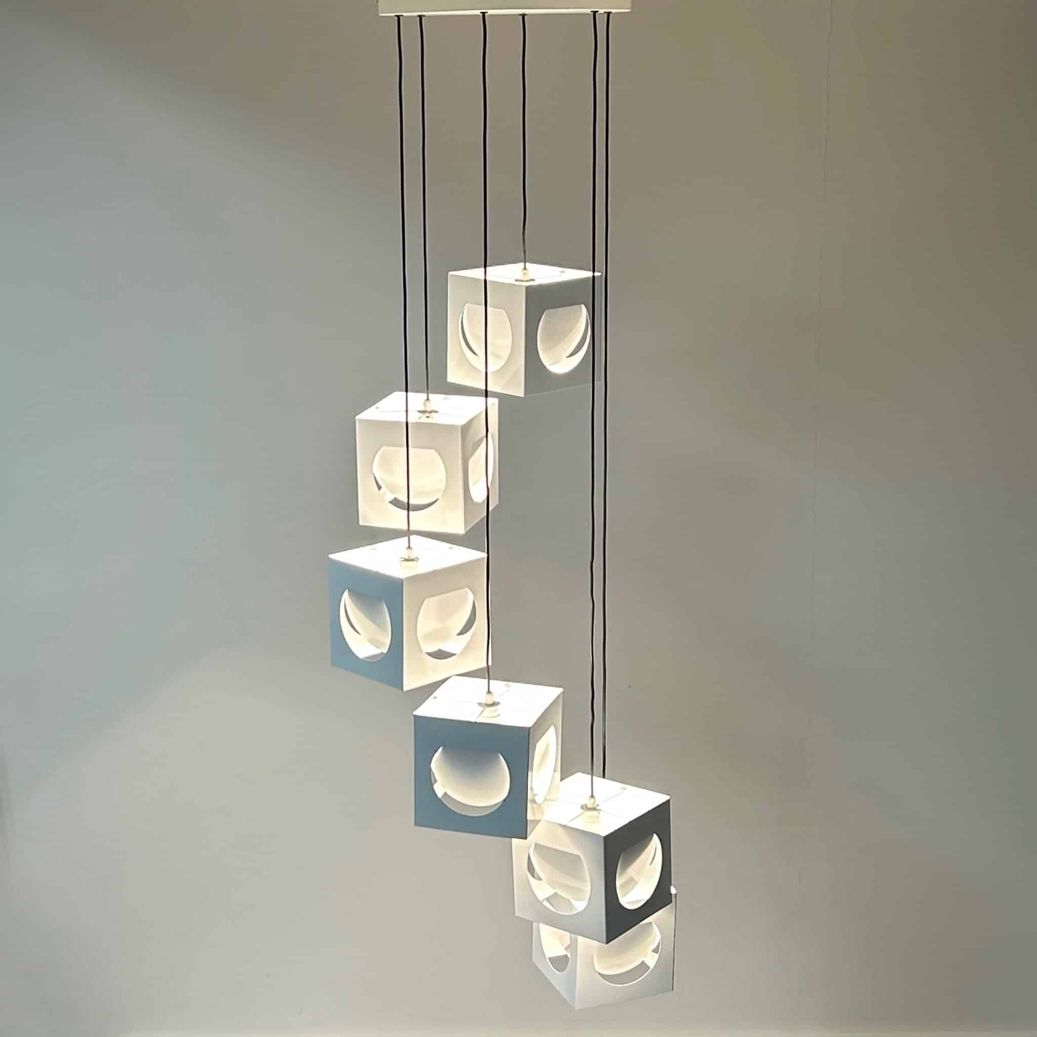 INCL. VAT ACCORDING TO THE MARGIN SCHEME (IF APPLICABLE)Stockmann Orno lamp from the 1960s, designed by Shogo Suzuki. This rare pendant lamp consists of a composition of six cube-shaped lamps (model 61-193) made of white metal, which create an impressive geometric play of light through the curved circular openings on each side of the cubes. The lamps are adjustable in height, so you can create different compositions depending on the space. The minimalist design has been carefully cleaned and polished, and is in good original condition with some signs of use, such as minor paint damages.