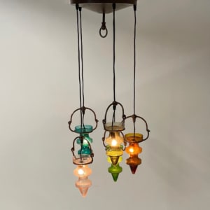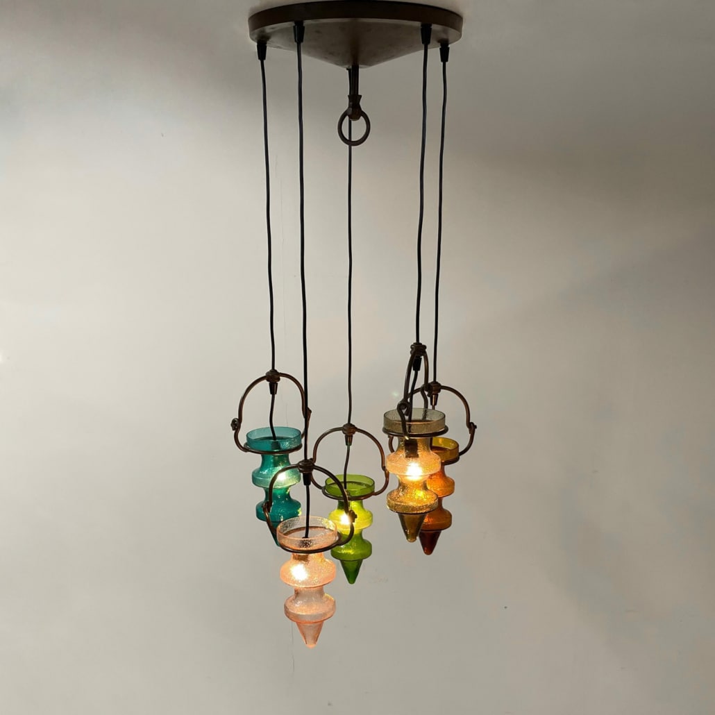 INCL. VAT ACCORDING TO THE MARGIN SCHEME (IF APPLICABLE)This beautiful “Stalactite” pendant lamp was designed by ‘Nanny Still’ for Massive & Val Saint Lambert in the 1960s. This Nanny Still lamp is made of of a metal ceiling plate with five glass shades in the colours brown, light green, amber, pink and dark green. These glass shades are also called “stalactites” and hang in a beautiful composition in wrought iron holders. Dimensions: h x w x d = 114 x 50 x 38 cm. Each shade measures: h x d = 26 x 11.5 cm and has a small screw bulb holder, max. 60 W per fitting. Condition: very good. Wiring checked by electrician.
