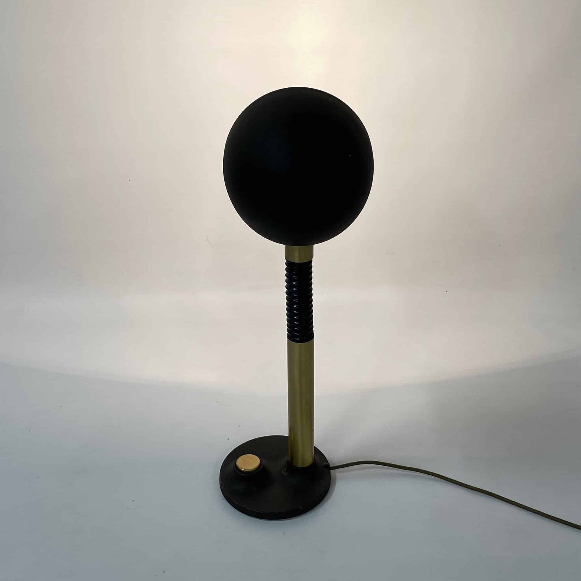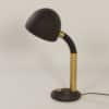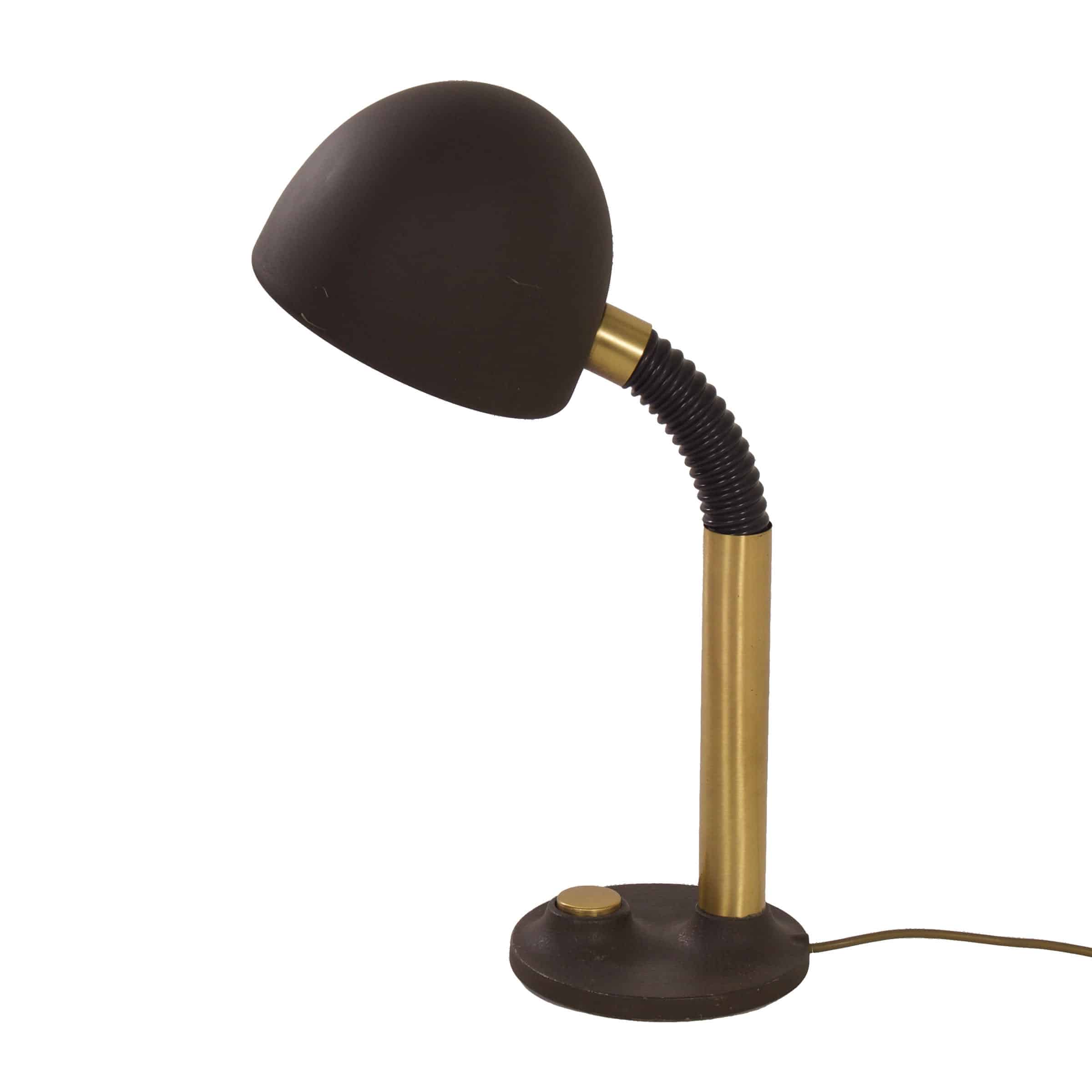 Adjustable Hillebrand desk lamp with brass accents and a large push button on the base made by the German company Hillebrand Leuchten in the seventies. The hood can rotate, and the upper part of the arm is flexible. This Hillebrand lamp is from the 1970s and is still in good condition with some signs of use and wear (see pictures). The lamp has a normal screw bulb holder (E27) and the wiring has been checked. Material: iron, brass and aluminium. Colour: brown, black and gold colouring. Dimensions (adjustable): h x w x d = 59 x 21 x 34 cm.