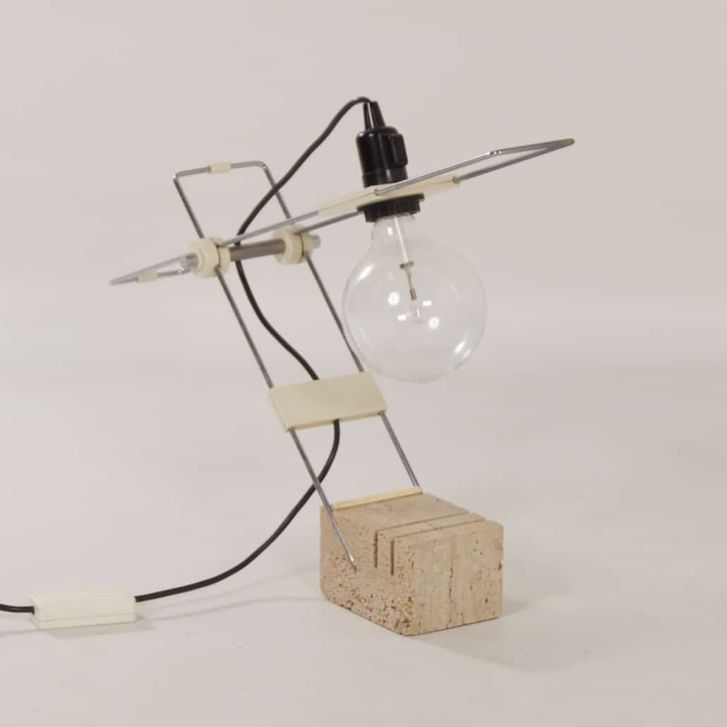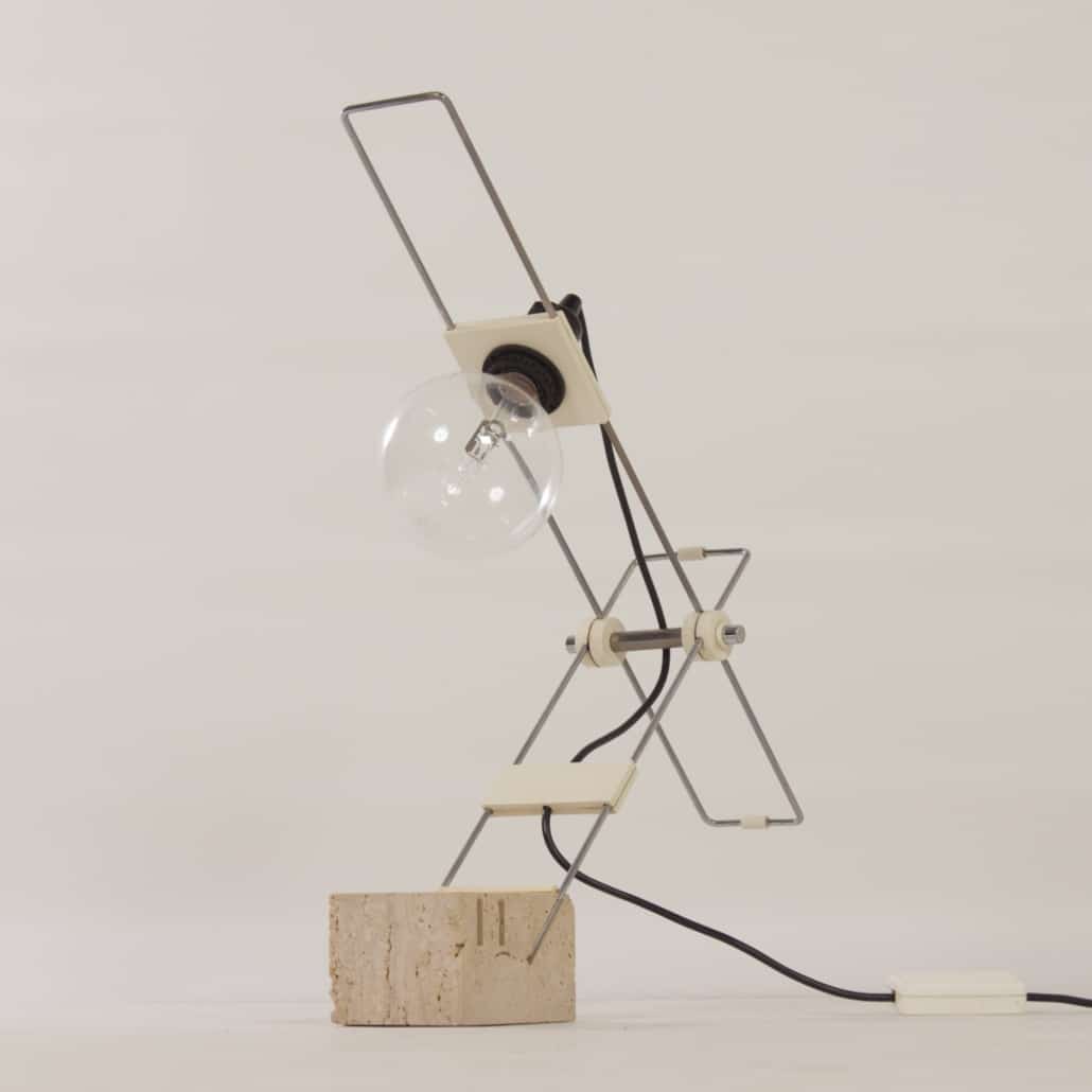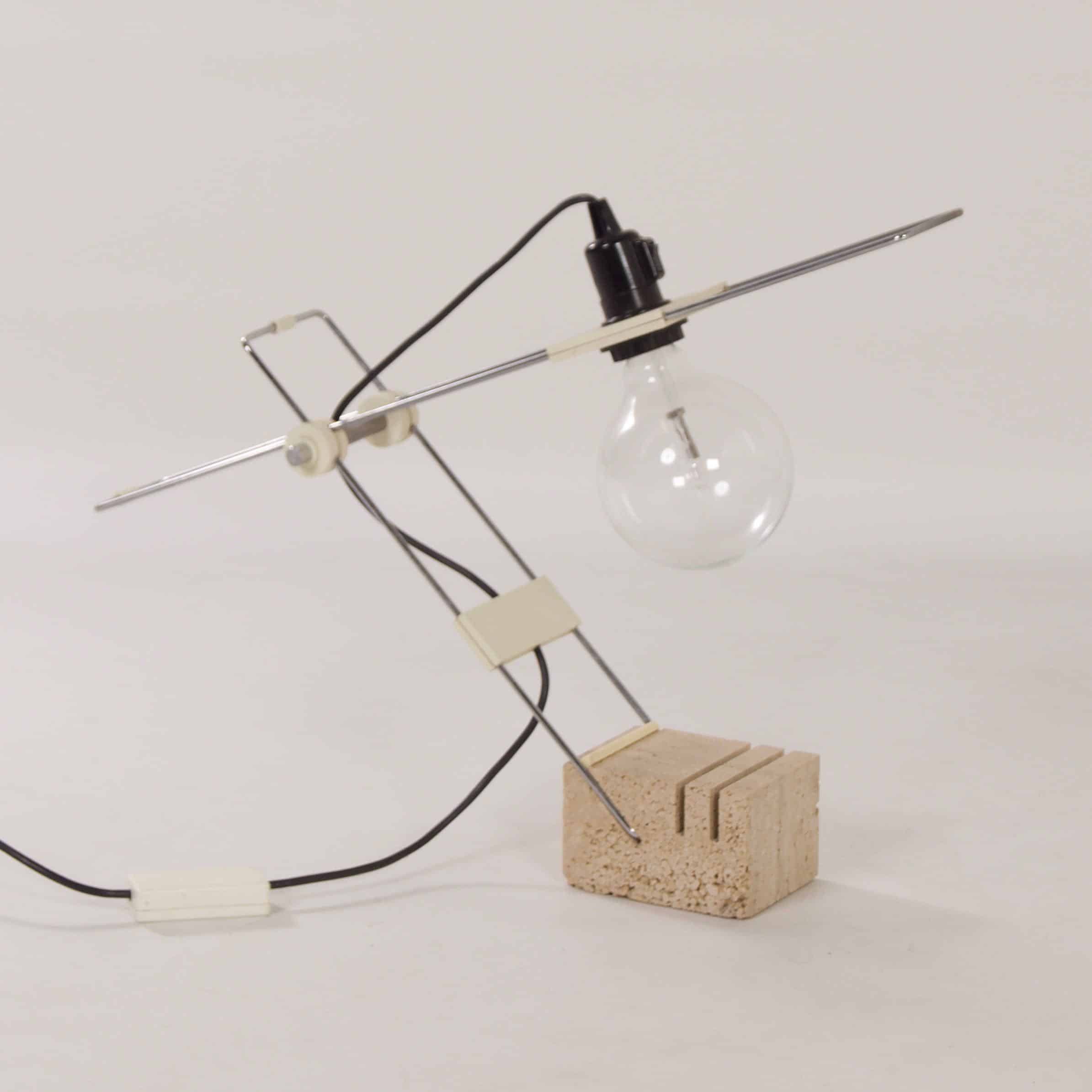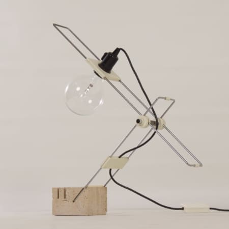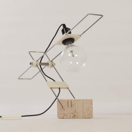 INCL. VAT ACCORDING TO THE MARGIN SCHEME (IF APPLICABLE)Modernist travertine desk lamp attributed to Fratelli Mannelli, Italy, 1970s. Fratelli is Italian for ‘brothers’. The Mannelli brothers from Signa, Italy (near Florence) are known for their travertine designs. Some examples are animals made of travertine for Sigma, but they also designed various lamps with a base of travertine. This desk or table lamp is fully adjustable. The condition is still very good, normal traces of use. On/off switch is included in the screw bulb holder, there is also a dimmer in the connection cord. The wiring has been checked. Dimensions: (adjustable) h x w x d = 57 x 54 x 10 cm. Material: travertine, chromed metal and plastic.