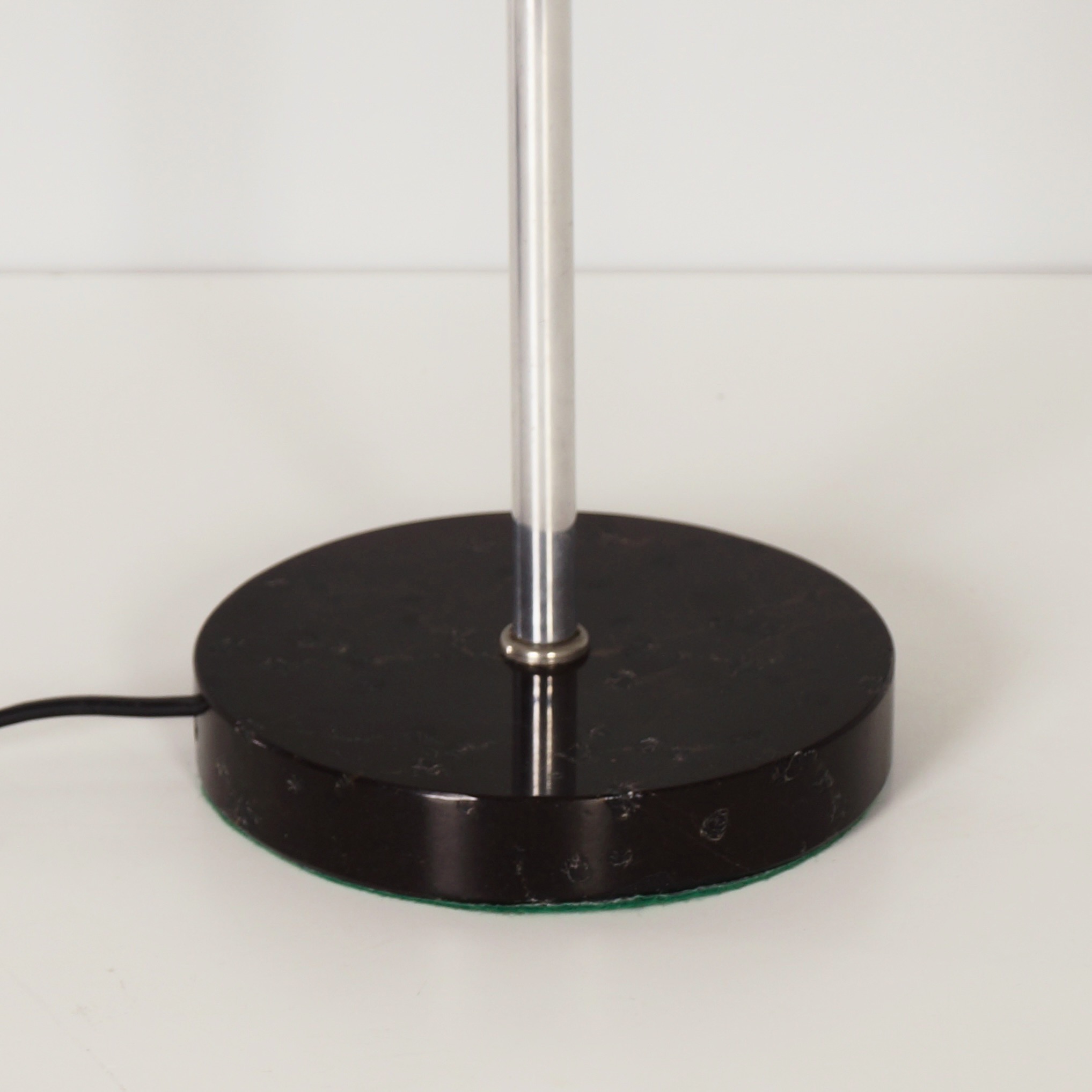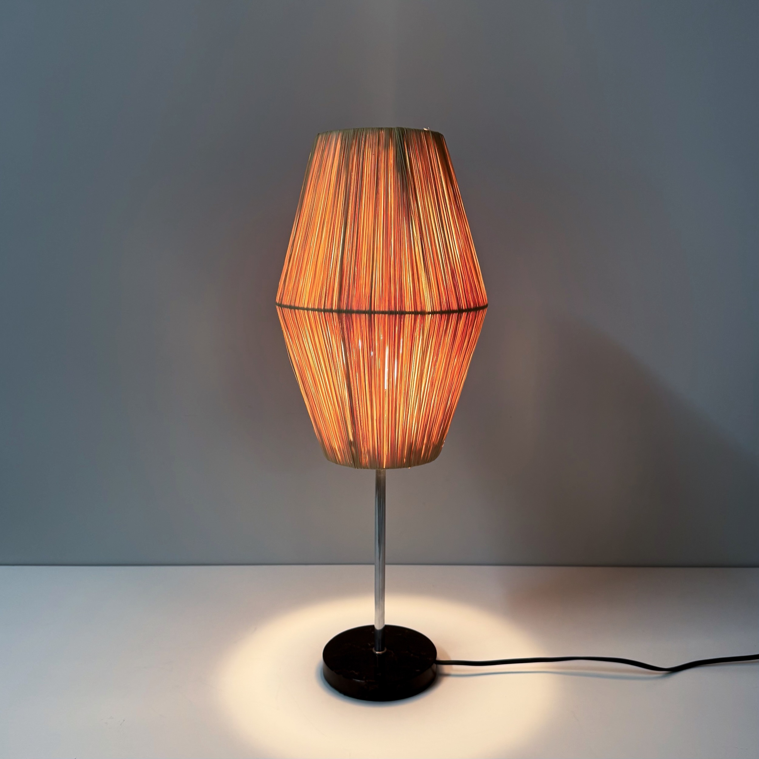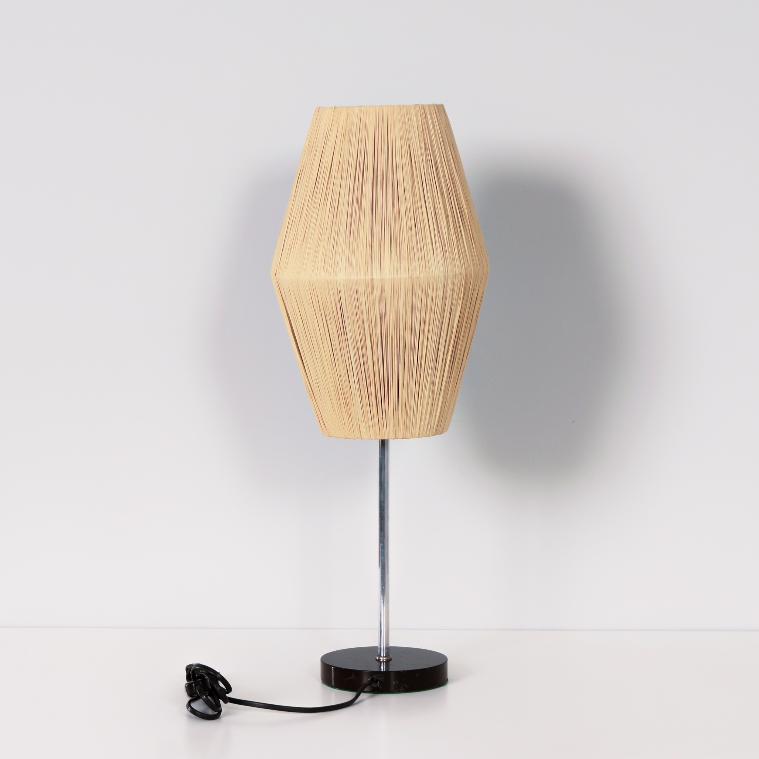 The lamp features a hand-knotted raffia shade on a metal frame, a chrome stem and a round marble base. Fitted with an E27 socket. Dimensions: 22 x 22 x 59 (H) cm. The diameter of the base is 13 cm. Dutch production, circa 1965.