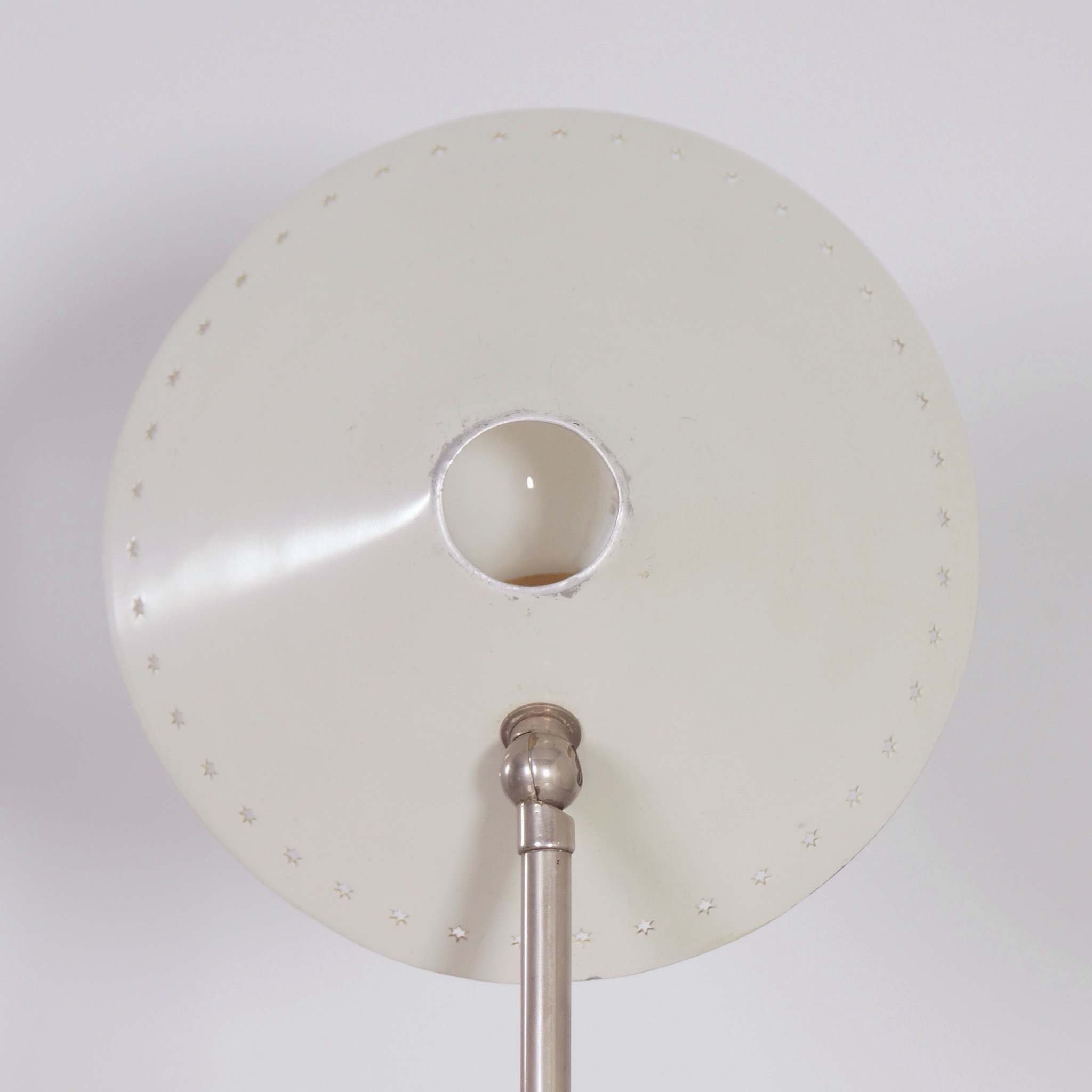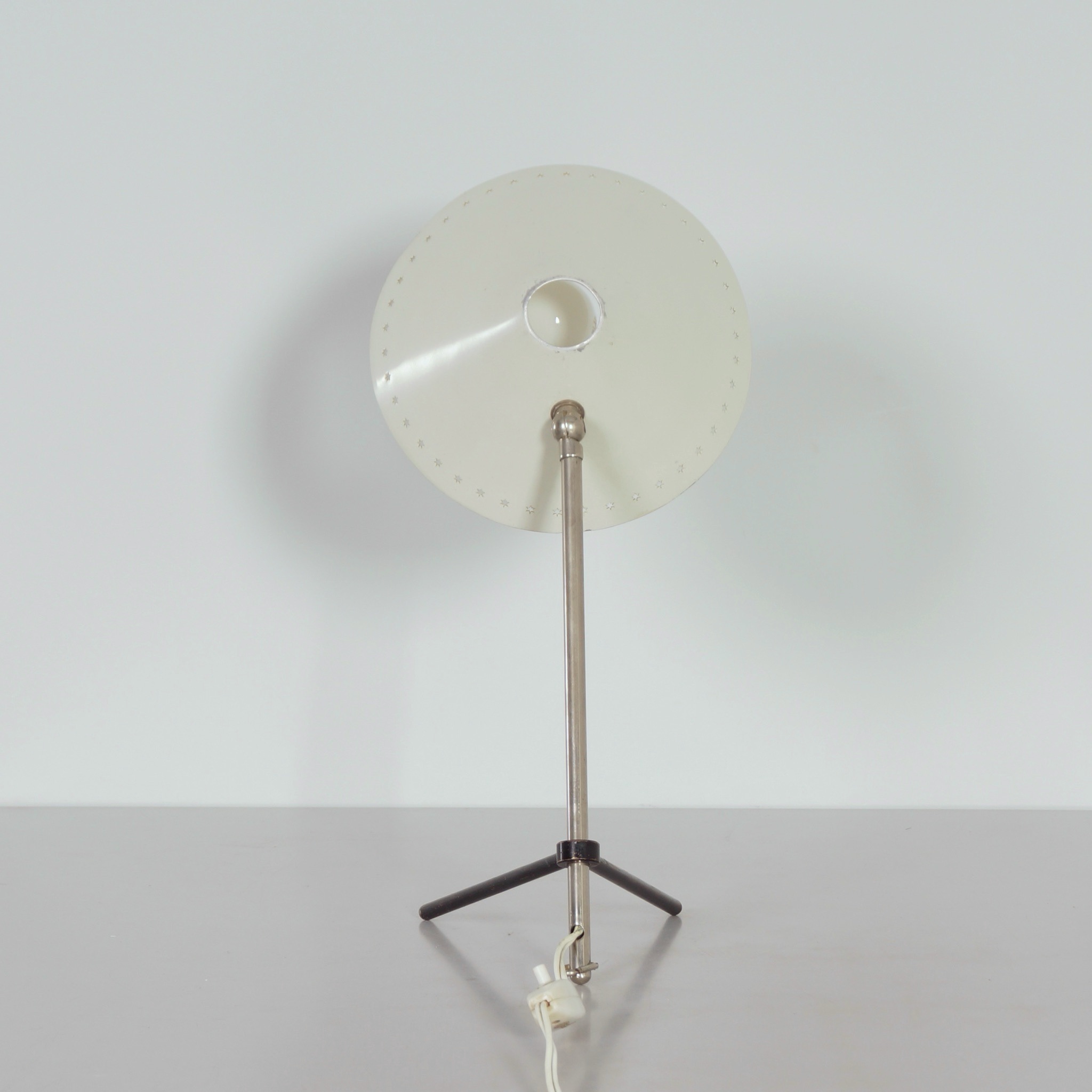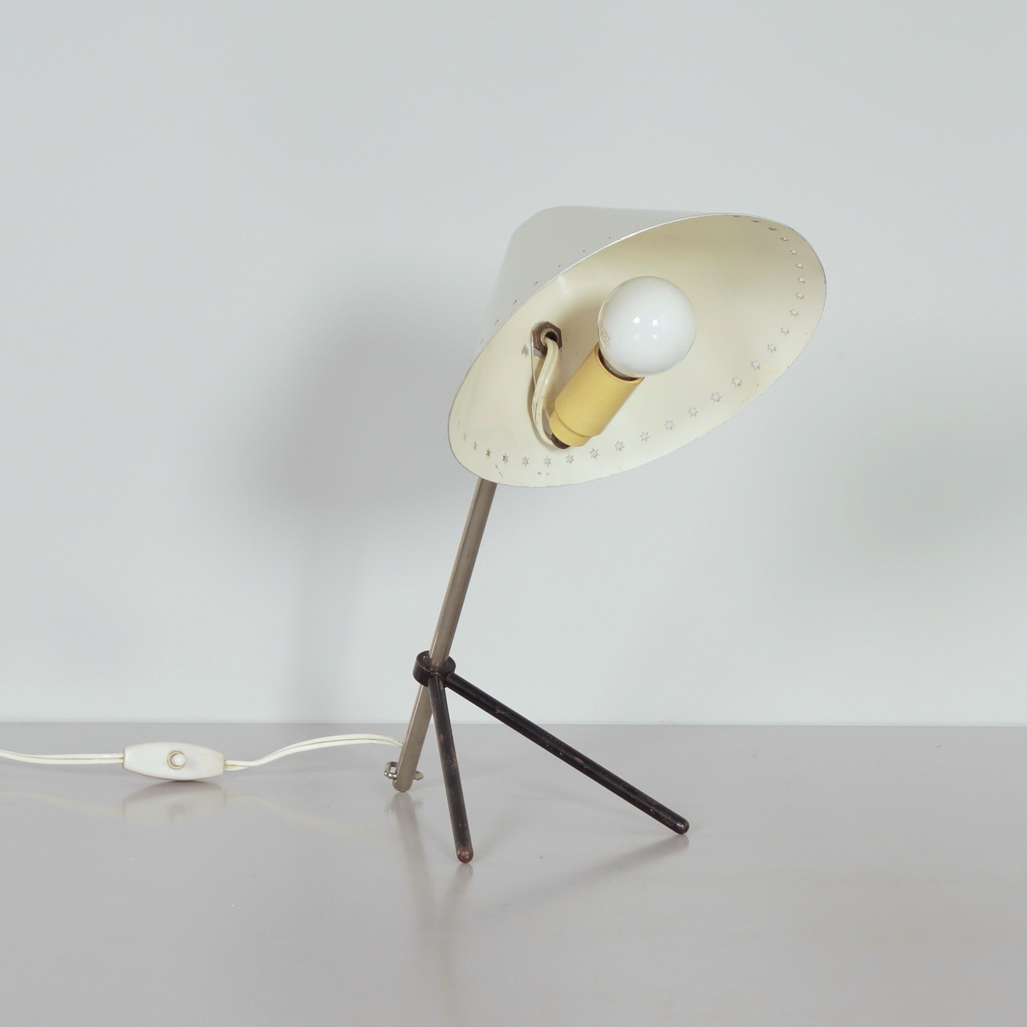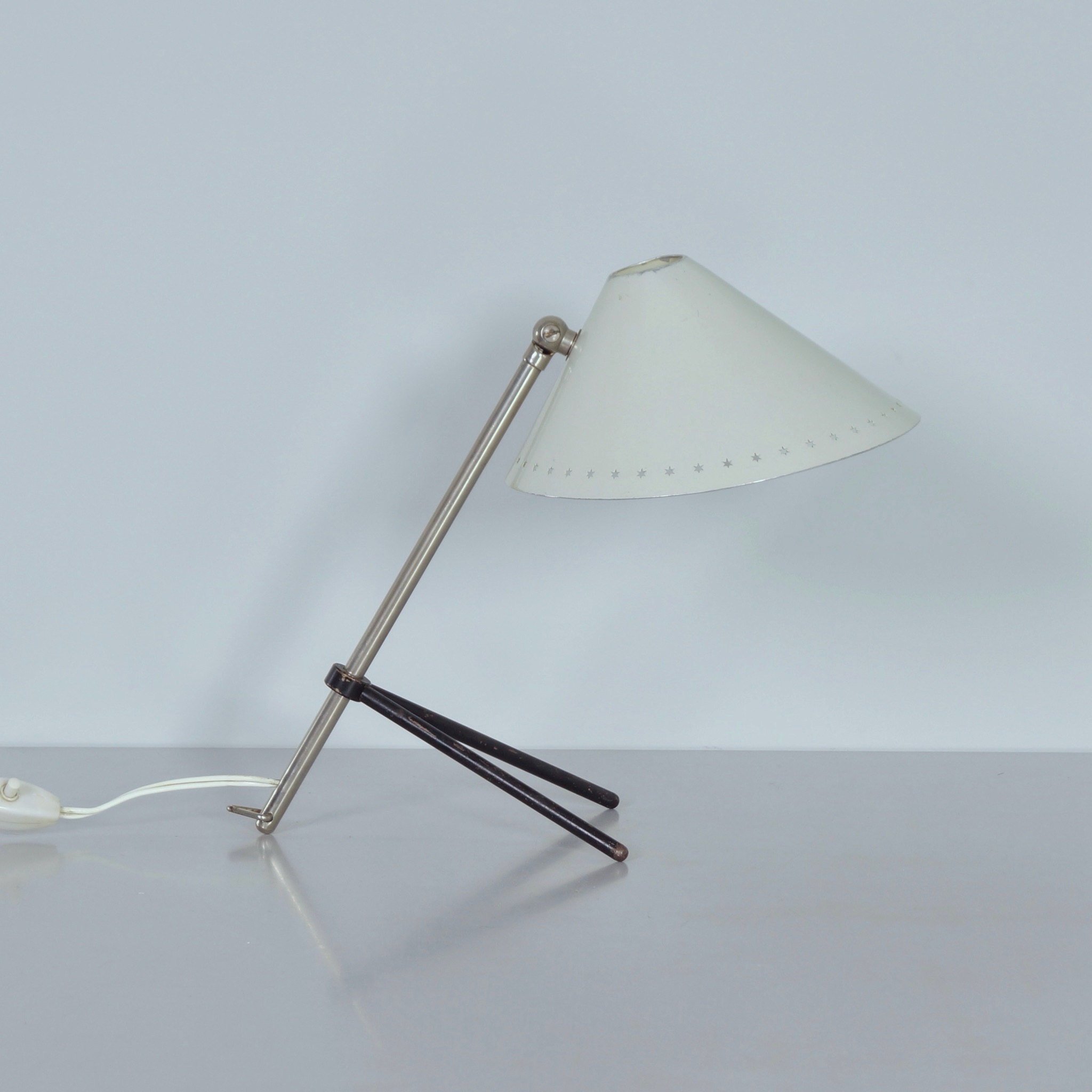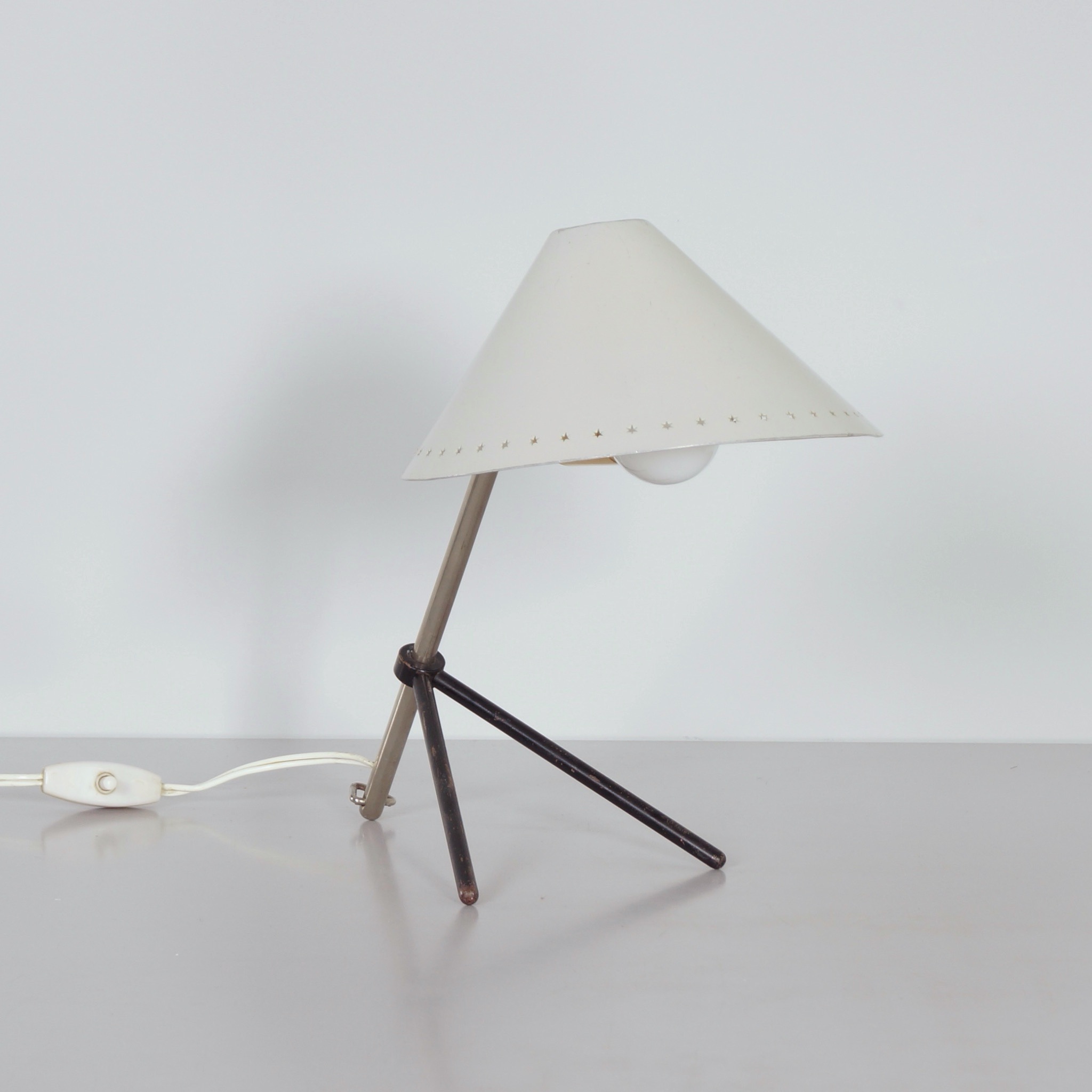 This Hala Pinocchio lamp was designed by H. Busquet in 1956 and is an early edition from the early 1960s. The metal lamp features an adjustable tripod and a tilting shade with the typical star-shaped perforations, creating an atmospheric light effect. Thanks to the triangular bracket, it can be used as a table, desk or wall lamp. Dimensions: 26 x 18.5 x 33 (H) cm / 10.2 x 7.3 x 13 (H) inches. Marked: Hala Zeist. Source: Hala catalogue 1955.
