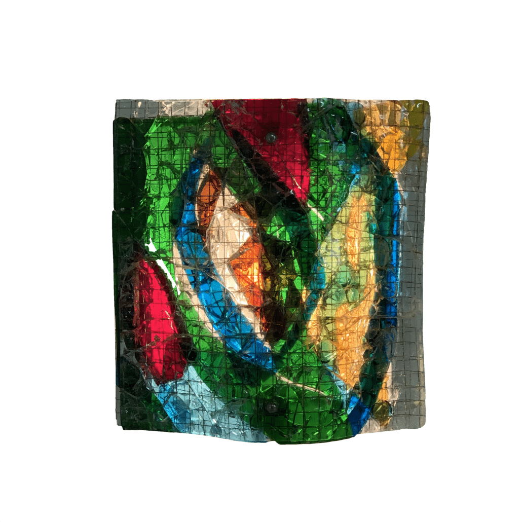 INCL. VAT ACCORDING TO THE MARGIN SCHEME (IF APPLICABLE)Coloured glass wall lamp made with glass appliqué at van Tetterode Glass Studio, Amsterdam in ca. 1960. The coloured layers of glass “glass appliqué” create a beautiful light effect. Floris van Tetterode founded the Glass Industry Van Tetterode in 1925. He experiments with a new one technique: bonding glass “glass appliqué” using a special primer, which bonds the layers of coloured / cracked / molten glass well together, creating a relief. Material: glass and metal Dimensions: h x w x d = 28 x 27 x 10 Well-known artists such as Appel and Corneille have asked Van Tetterode Glass in Amsterdam to make artworks.