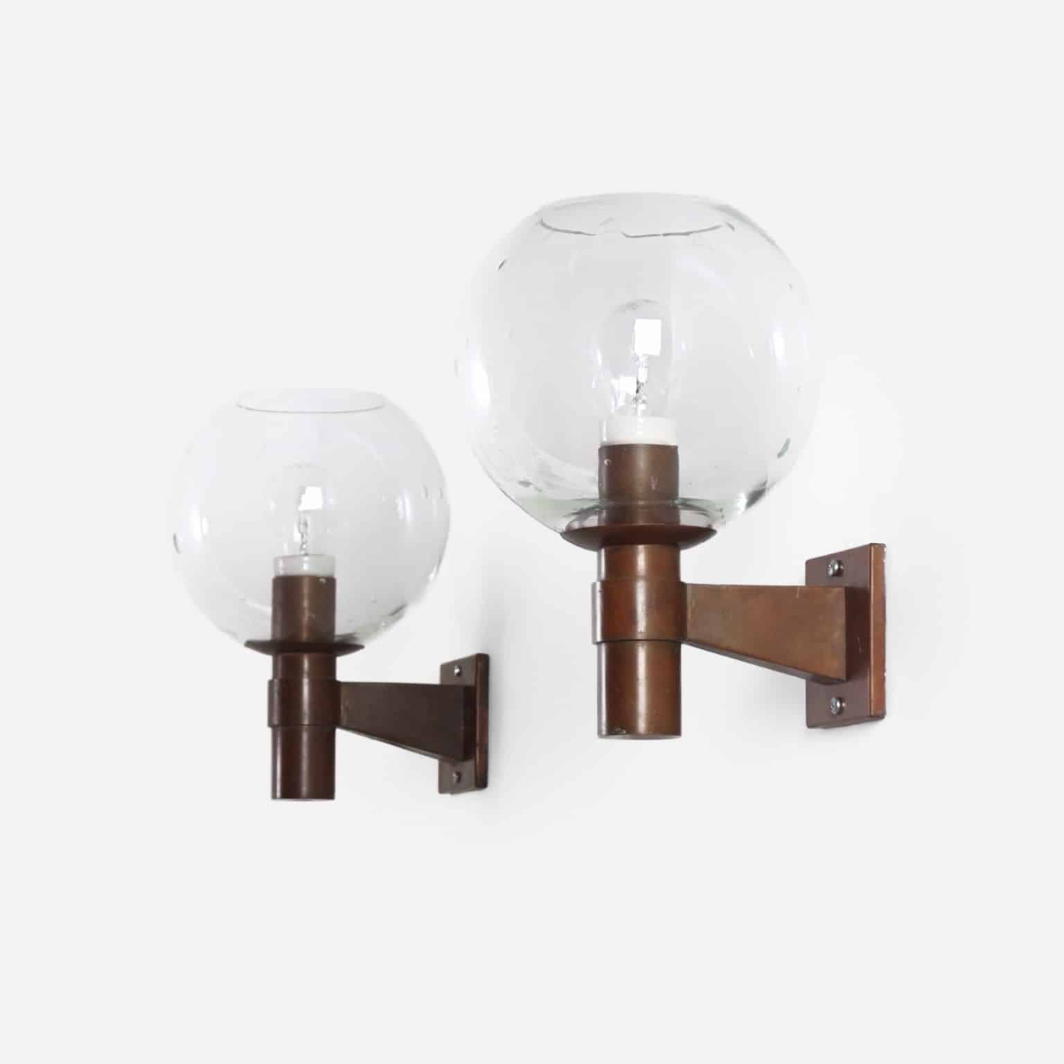 INCL. VAT ACCORDING TO THE MARGIN SCHEME (IF APPLICABLE)Pair of beautiful solid brass wall lights with a glass globe with drops (in the glass) from the 60s. The brass crew bulb holders are made in the style of the Amsterdam School style and probably commissioned for a building in Rotterdam. Considering its age these wall lamps are still in very good condition: normal signs of use and wear (see pictures). The wiring has been checked. Dimensions: H x W x D = 28 x 20 x 22 cm.